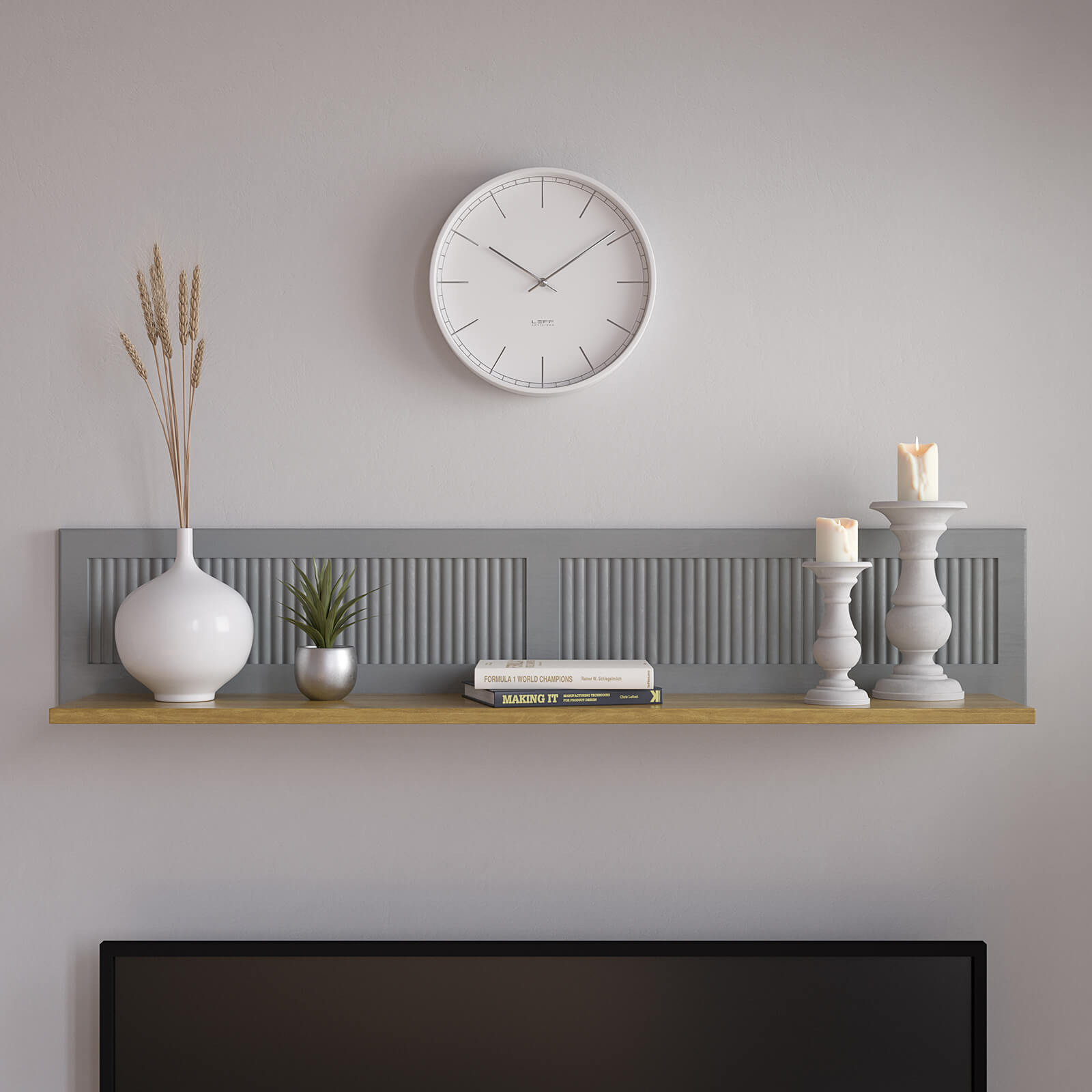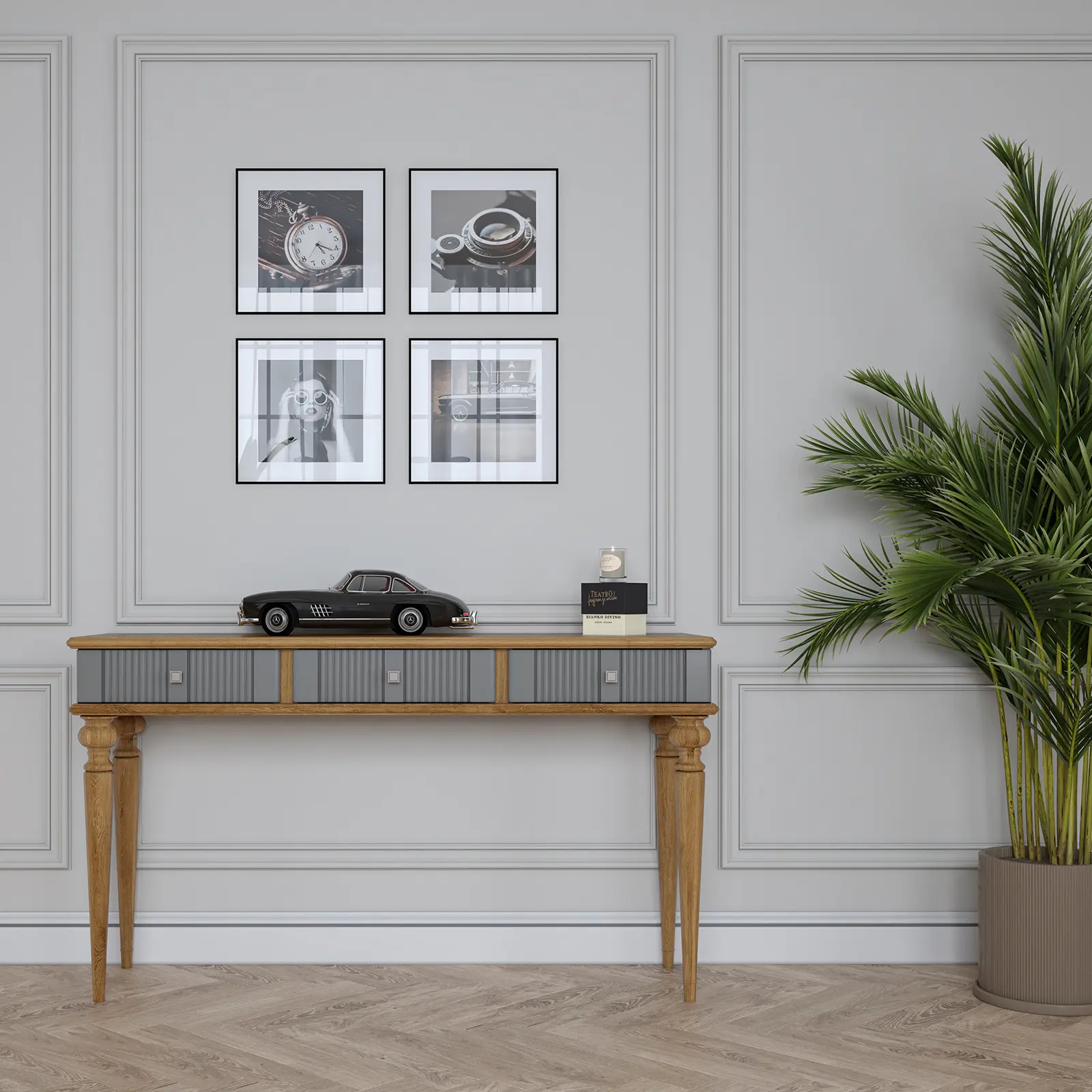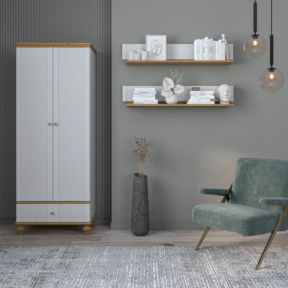 Мебель предлагается в двух цветовых комбинациях: белый лак/«антик 24» и серый/«антик 24». Корпуса и фасады окрашиваются в белый или серый тона, а столешницы, карнизы, основания и внутренние перегородки в тон «антик». На дверцах и ящиках металлические ручки-кнопки с искусственным состариванием.