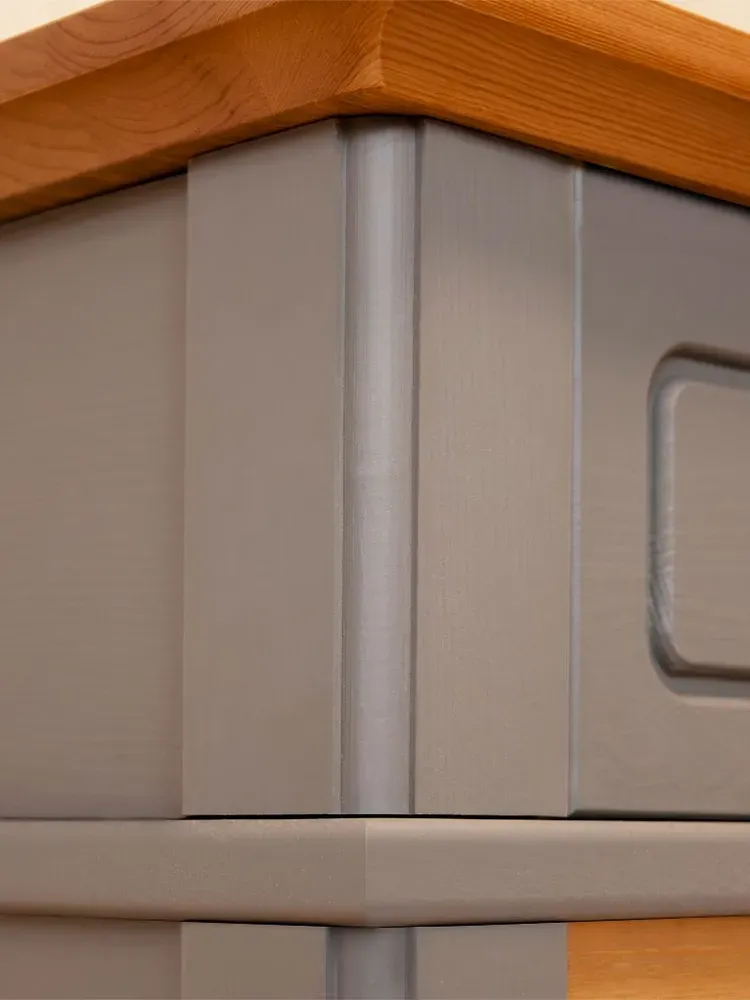Столик выполнен в двух контрастных цветах, сером и антике (светло-коричневом). В серый цвет окрашены корпус и фасады стола, а в цвет антик – столешница и нижняя декоративная планка. Для отделки применяются матовые лаки от шведской компании Becker Acroma. Лаки не дают сильного запаха, устойчивы и безопасны для здоровья.