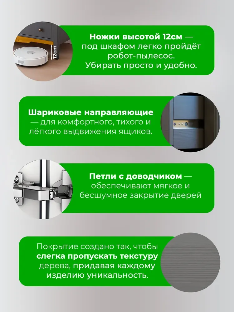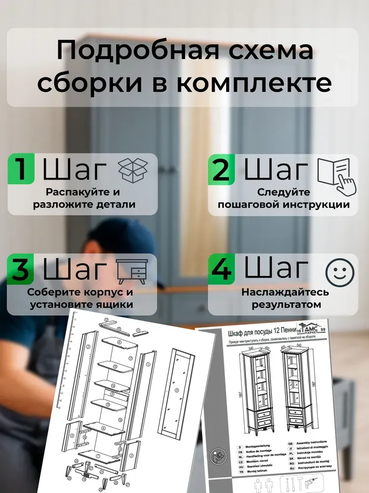 В комплект входит все необходимое для сборки: фурнитура, крепеж (включая заглушки на отверстия) и понятная инструкция. Закажите в нашей компании профессиональную сборку в удобное для вас время. На шкаф дается гарантия 12 месяцев.