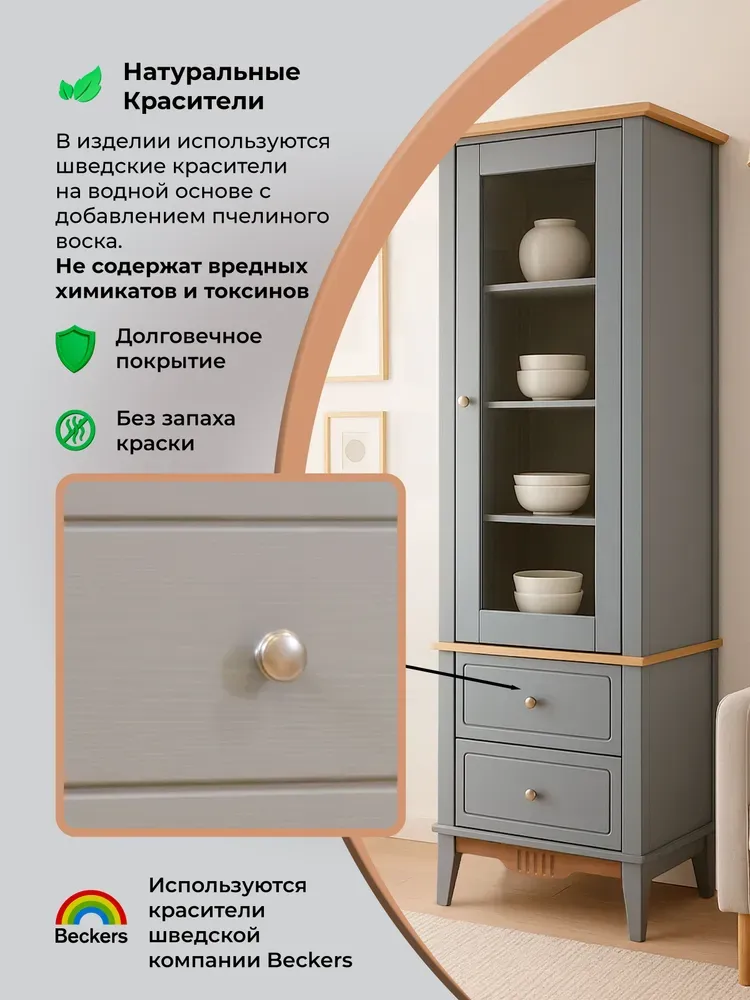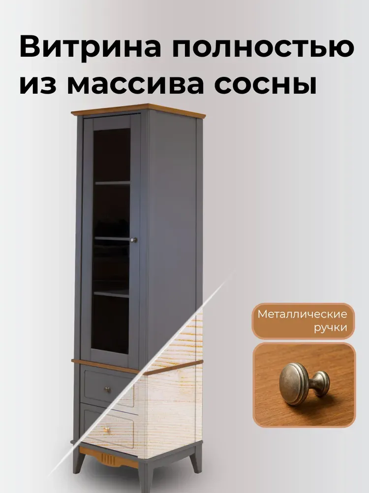 За остекленной дверцей расположены три полки из массива сосны, которые можно переставлять по высоте. Дверные петли фирмы Hettich оснащены доводчиками для плавного закрывания. Выдвижные ящики монтируются на шариковых направляющих частичного выдвижения, без доводчиков.