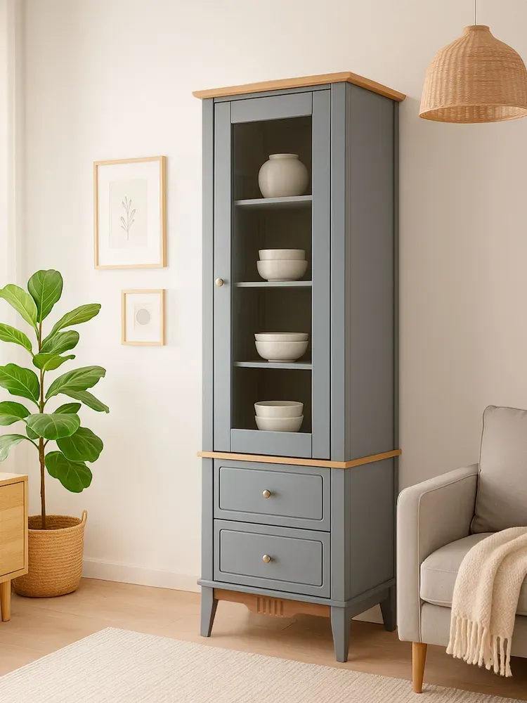 Одностворчатый остекленный шкаф «Пенни» с ящиками выполнен в популярном скандинавском стиле, с минимумом декора. Шкаф разработан и изготовлен совместными усилиями немецких дизайнеров, мебельной фабрики ММЦ (Минск) и компании «ДМС-маркет» (Санкт-Петербург). Шкаф предназначен для хранения посуды, но при желании его можно использовать как книжный или бельевой. Узкий шкаф «Пенни» будет хорошо смотреться и в гостиной, и в спальне, и в рабочем кабинете.