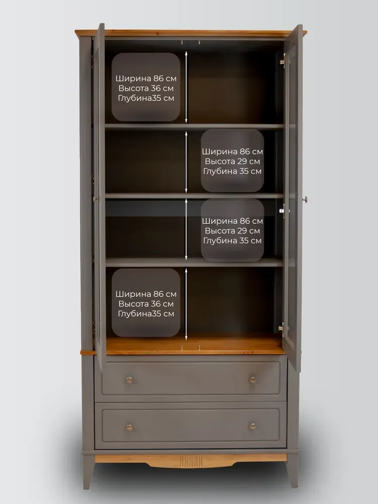 Корпус шкафа и полки окрашены в строгий серый цвет, а карниз, перекрытие и нижняя планка – в приятный цвет антик, через который виден природный рисунок древесины. Донья ящиков сделаны из белого оргалита, а стенки ящиков – из массива сосны и отделаны в цвет корпуса. Фасады и нижняя планка украшены фрезеровкой. Ручки-кнопки с искусственным старением привносят в дизайн легкий винтажный оттенок.