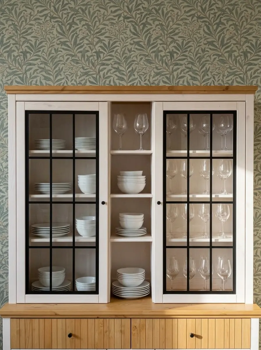 Буфет состоит из комода и надстройки. Верх имеет две распашных стеклянных дверцы, за которыми расположены деревянные полки. Посередине находится открытая декоративная секция. Низ тумбы совмещает в себе стеклянные фасады (2 штуки) и ящики (2 больших и 3 маленьких).