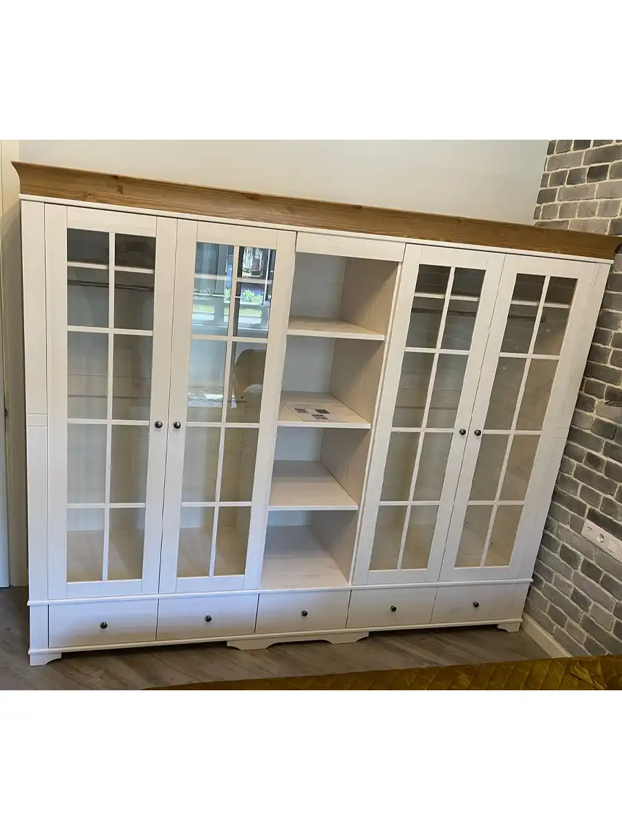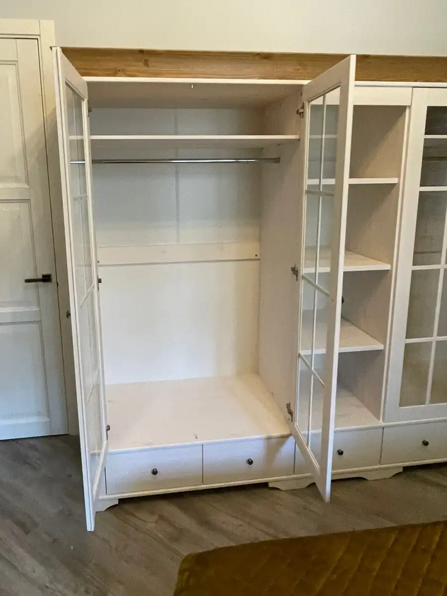 Шкаф имеет 3 отделения: правое и левое отделения с полкой и штангой под ней, среднее отделение имеет 3 полки, которые регулируются по высоте. Под каждой дверью имеется выдвижной ящик на роликовых направляющих.