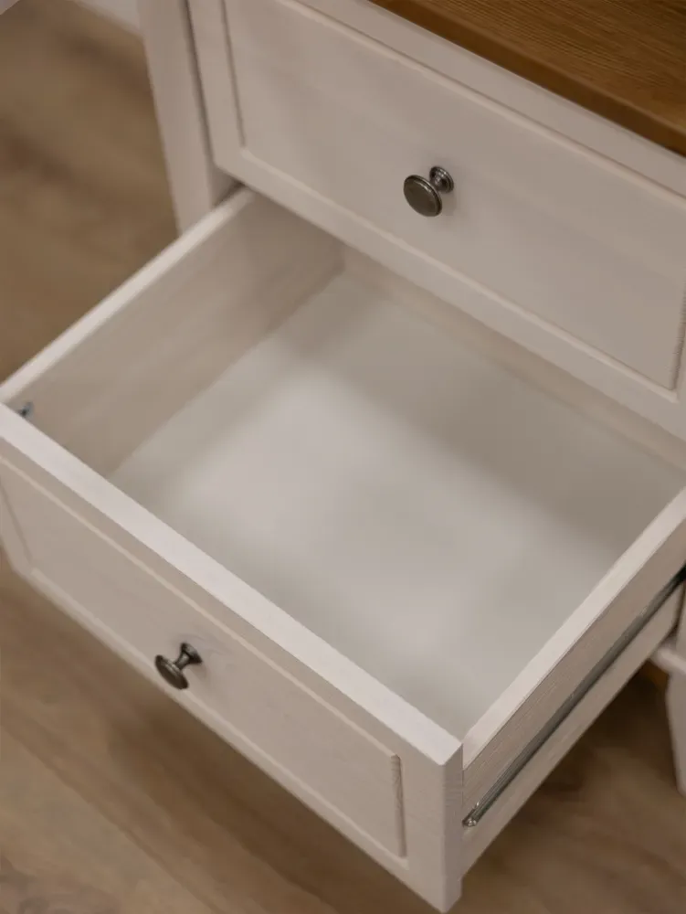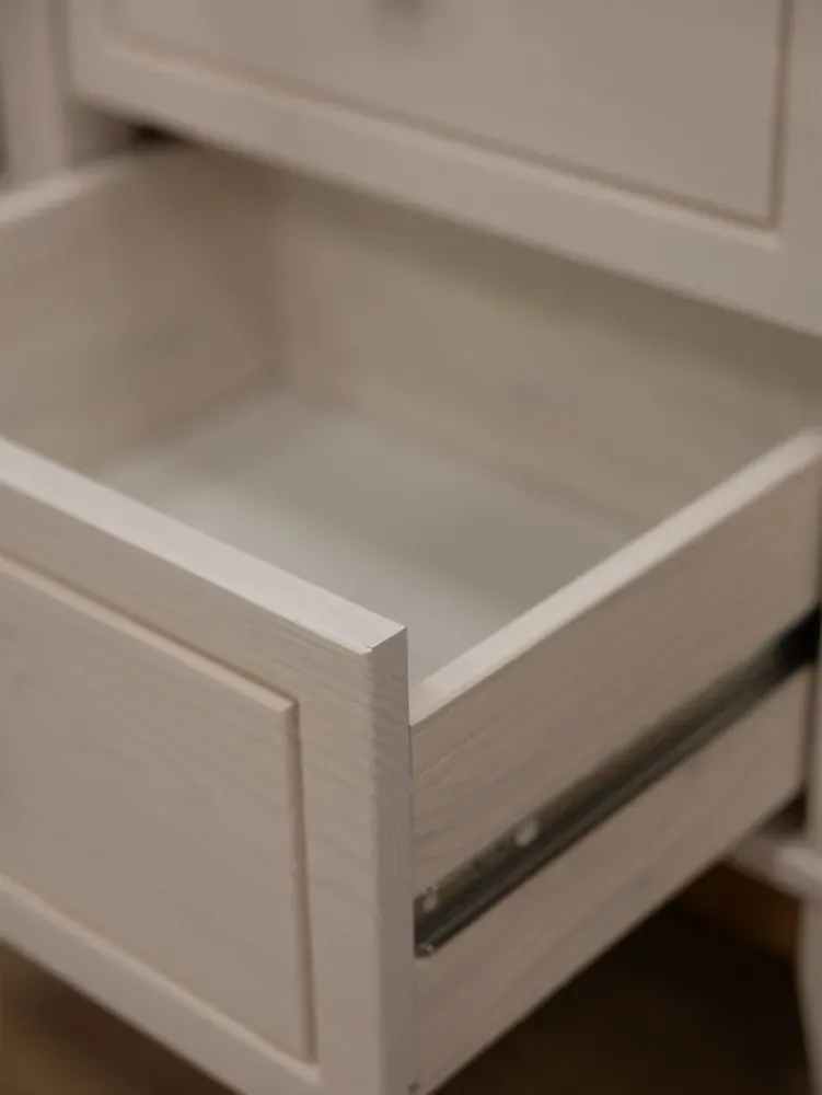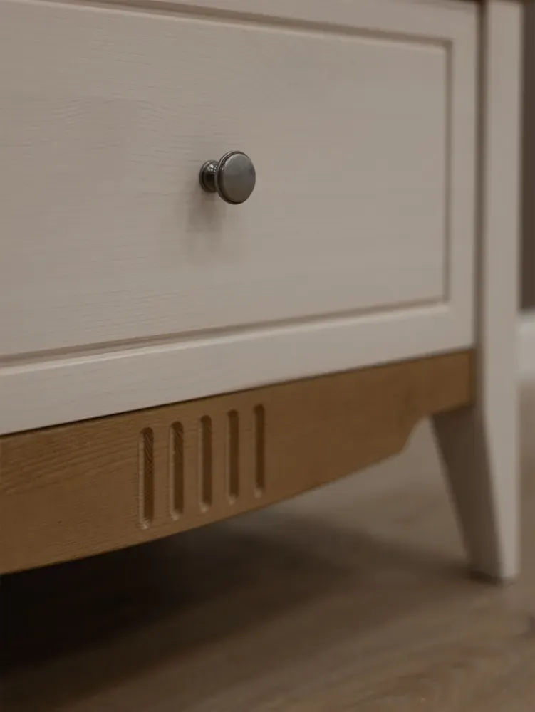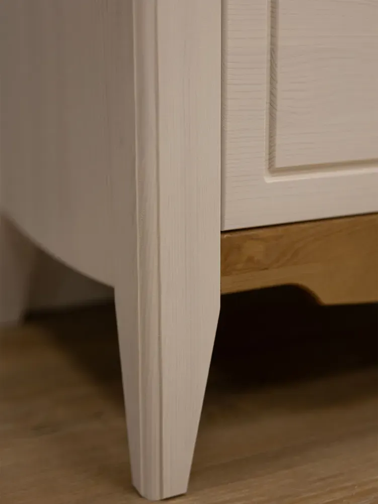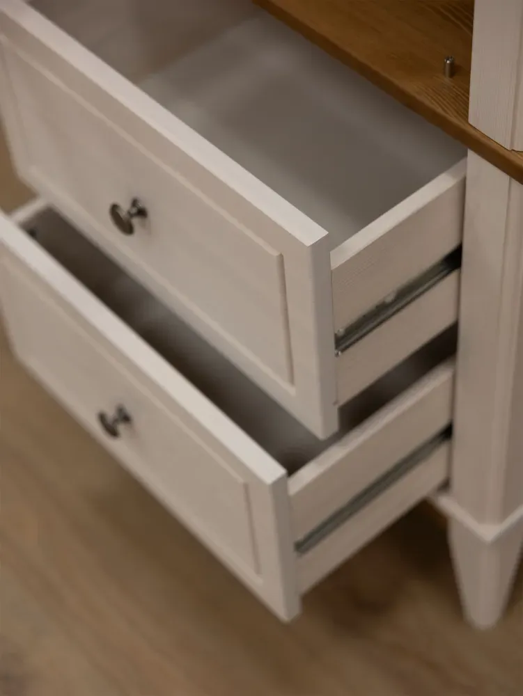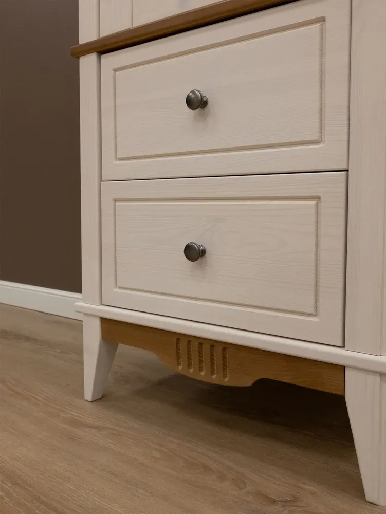 Корпус и фасады шкафа изготовлены из массива сосны, донья ящиков из оргалита. Корпус и фасады окрашены в белый цвет, а карниз, перекрытие над ящиками и нижняя планка – в цвет антик. Доступна эта же модель в отделках «серый/антик» и «черный/антик». Через покрытие антик можно рассмотреть природную текстуру сосны. Фасады шкафа, нижняя планка и ножки декорированы фрезеровкой, в неброском дизайне отлично смотрятся металлические ручки-кнопки с эффектом старения. Стенки ящиков окрашены в цвет корпуса и фасадов. Для окрашивания применяются матовые лаки шведской компании Becker Acromа. Лаки сертифицированы по европейским стандартам качества, они стойкие, не пахнут и безопасны для аллергиков.