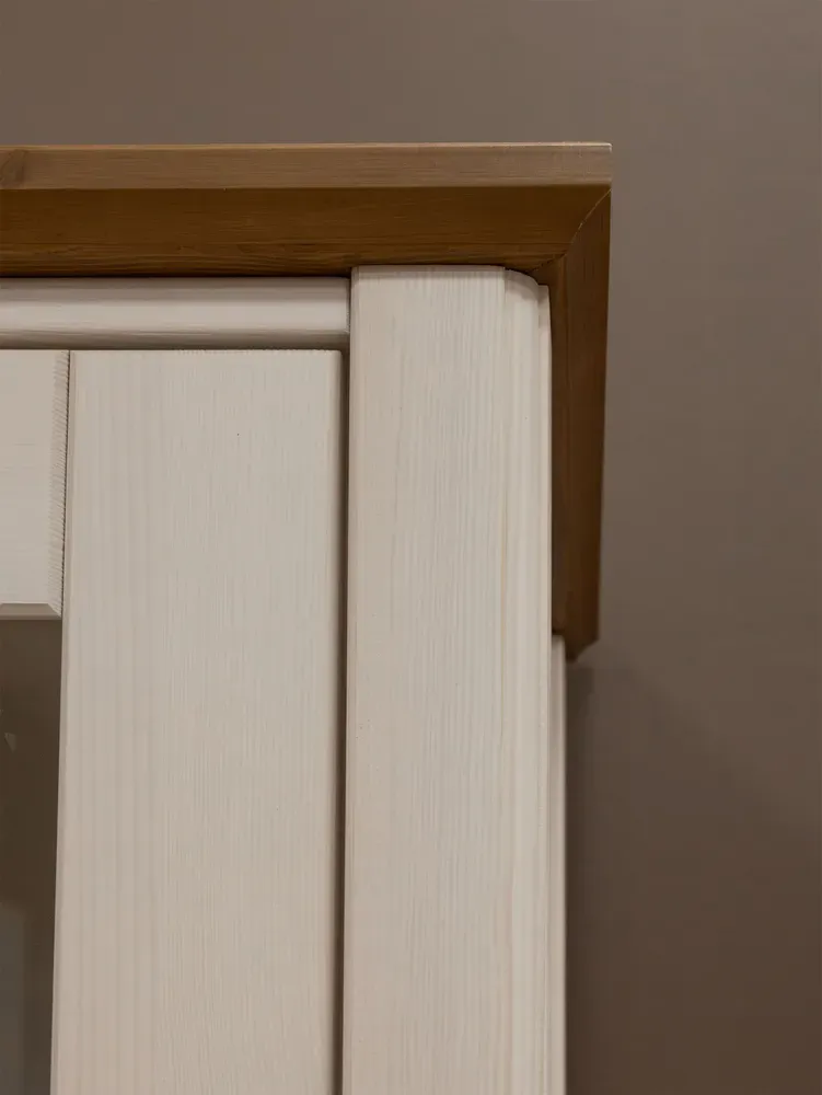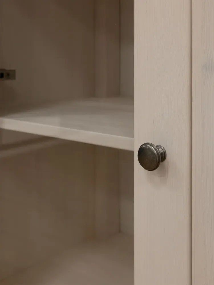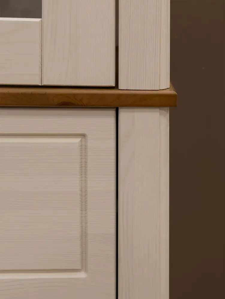 За остекленной дверцей расположены три полки из массива сосны, которые можно переставлять по высоте. Дверные петли фирмы Hettich оснащены доводчиками для плавного закрывания. Выдвижные ящики монтируются на шариковых направляющих частичного выдвижения, без доводчиков.