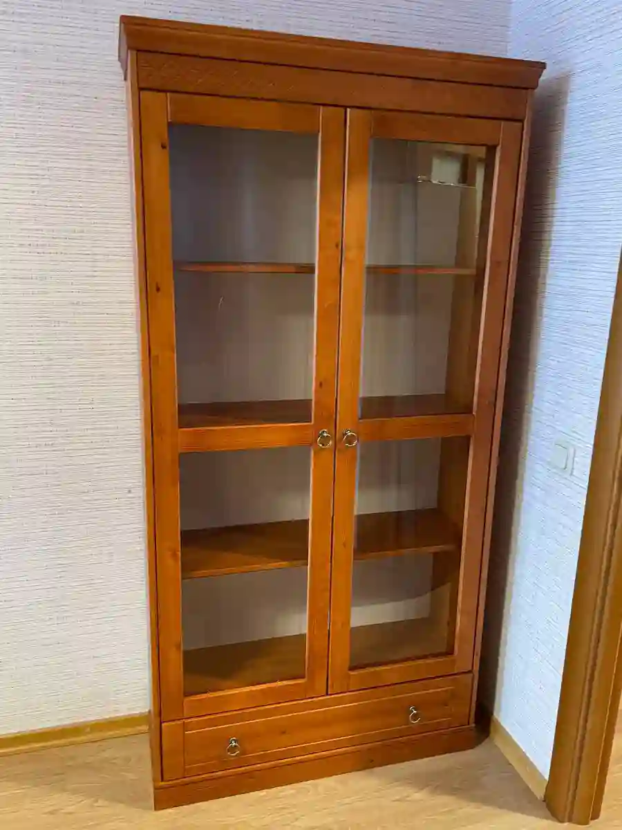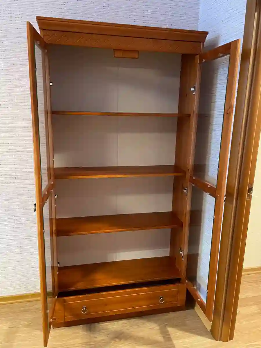 В шкафу 3 полки и выдвижной ящик на роликовых направляющих.