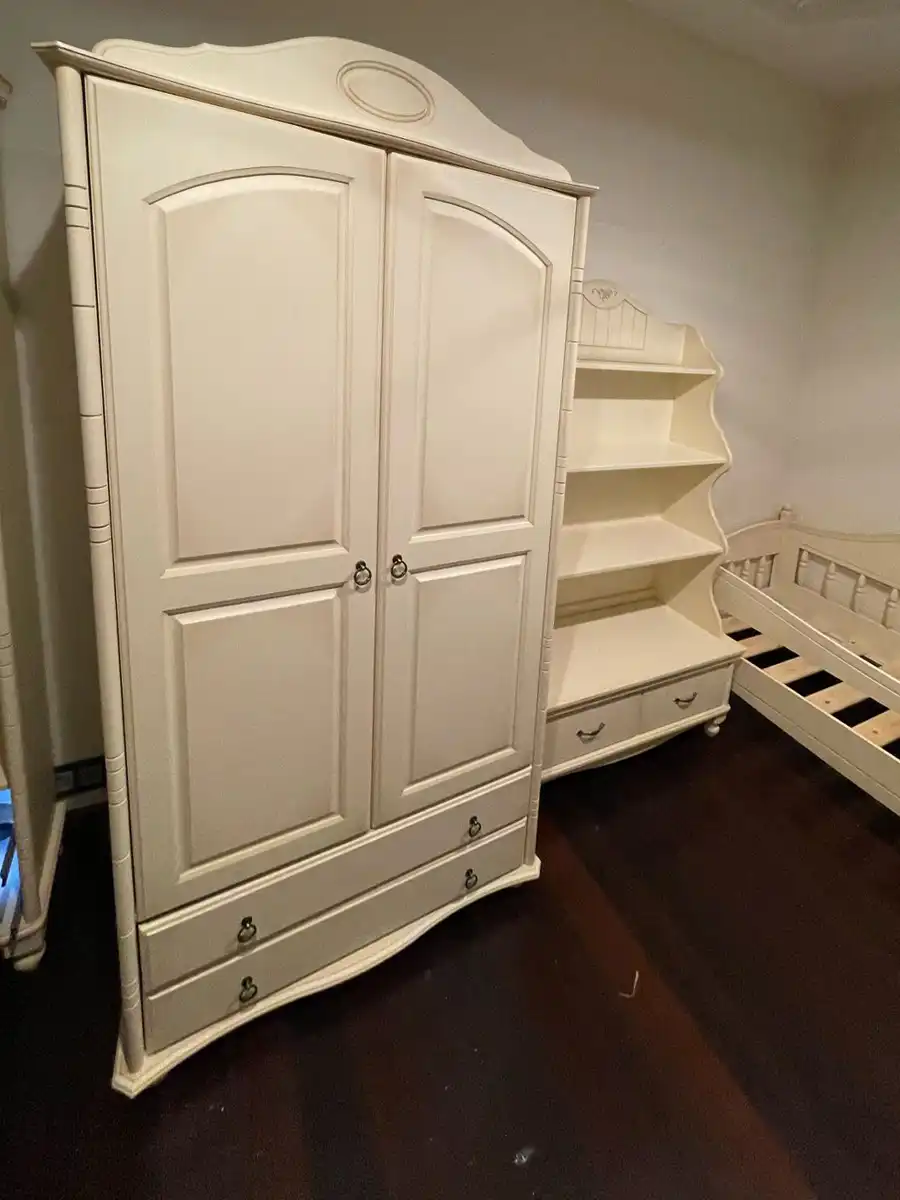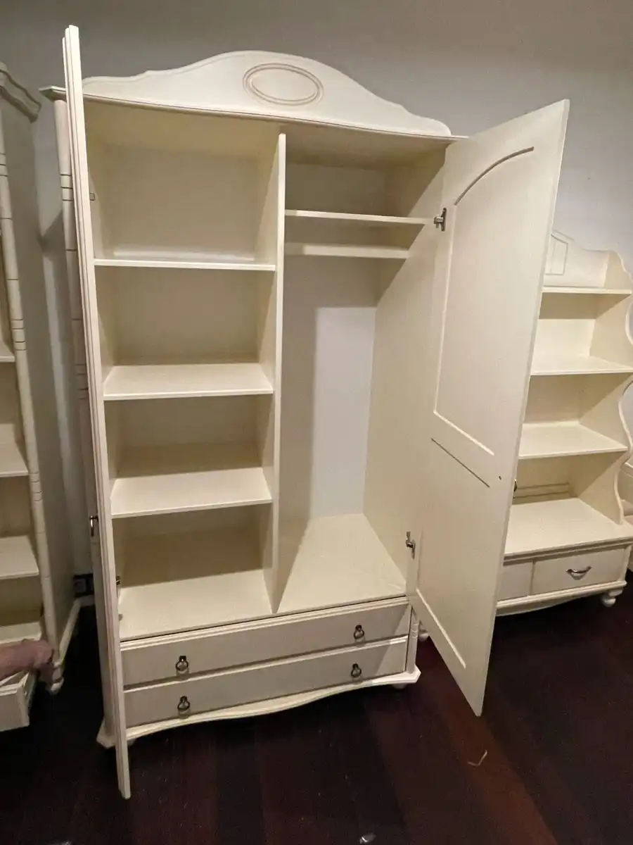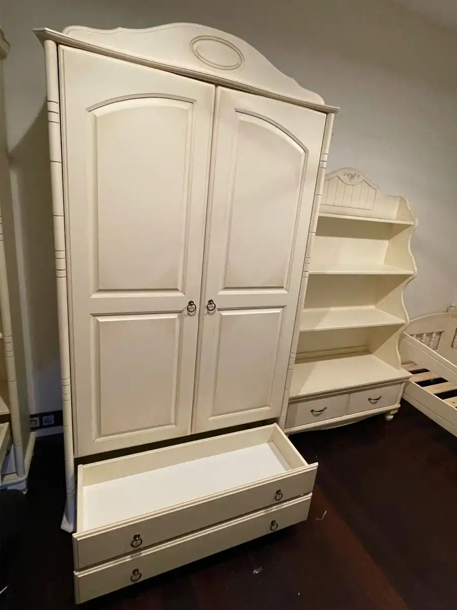 Цвет шкафа на титульной фотографии - скандик белый. При заказе мебели в составном цвете цена считается по более дорогому. Резные накладки красят в цвет боковин.