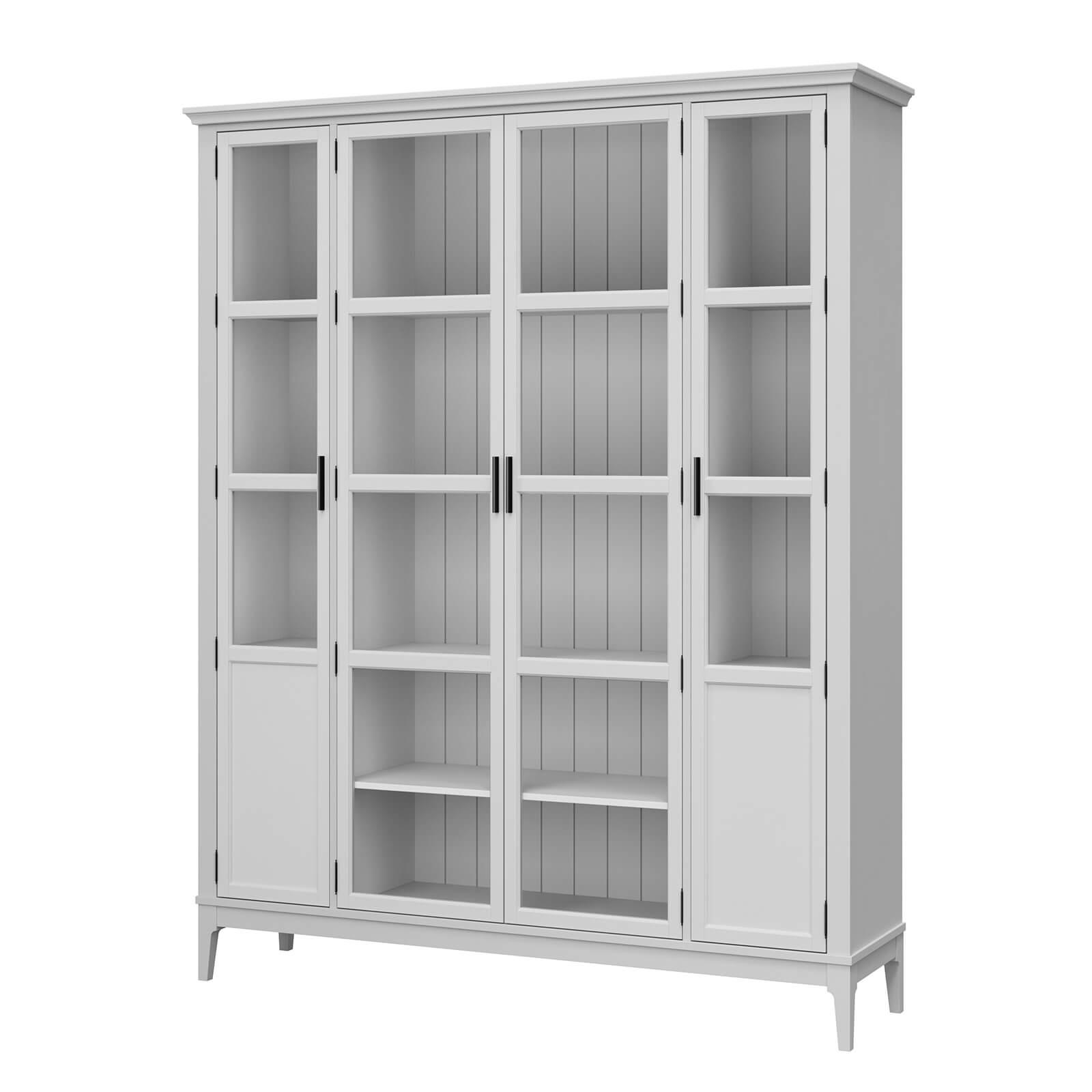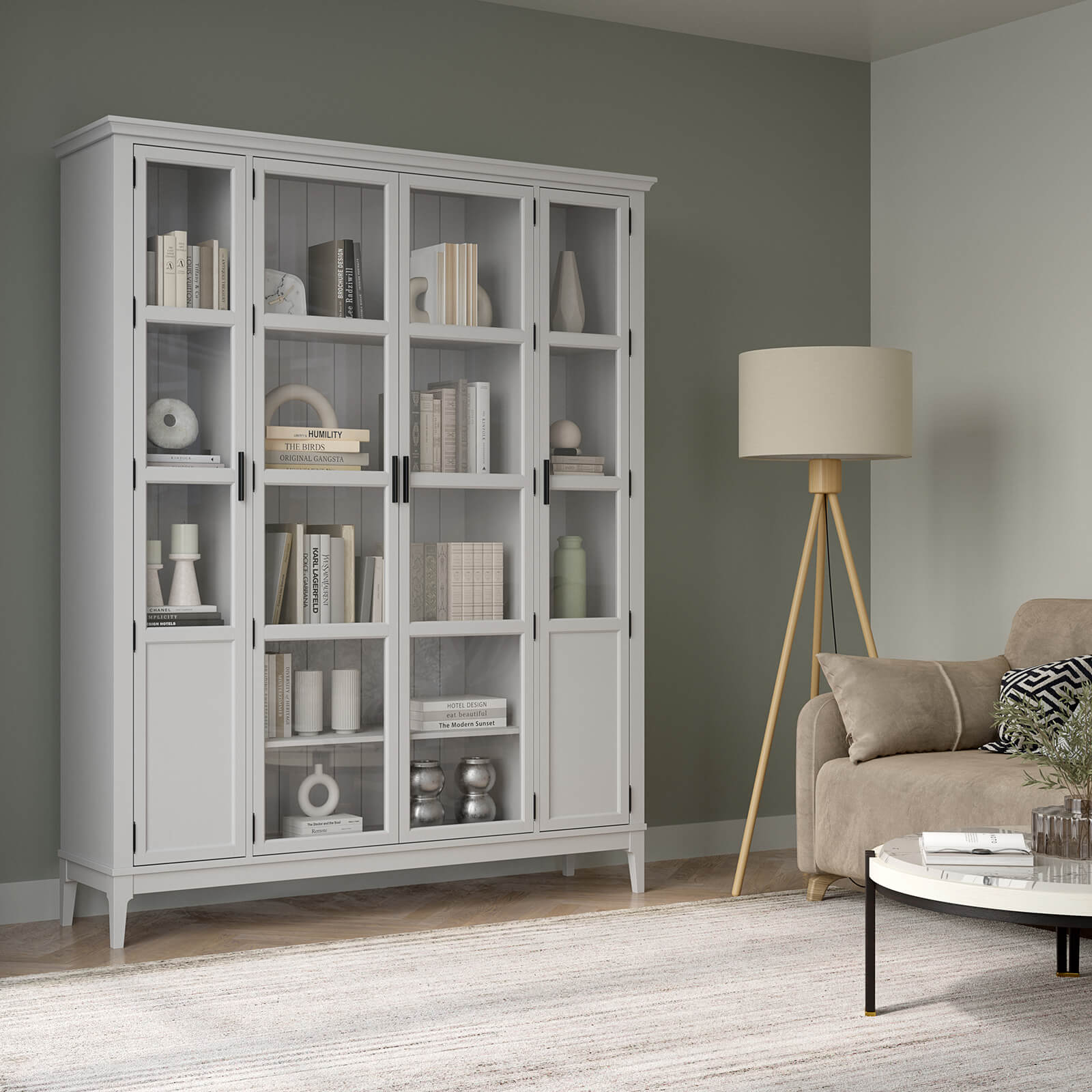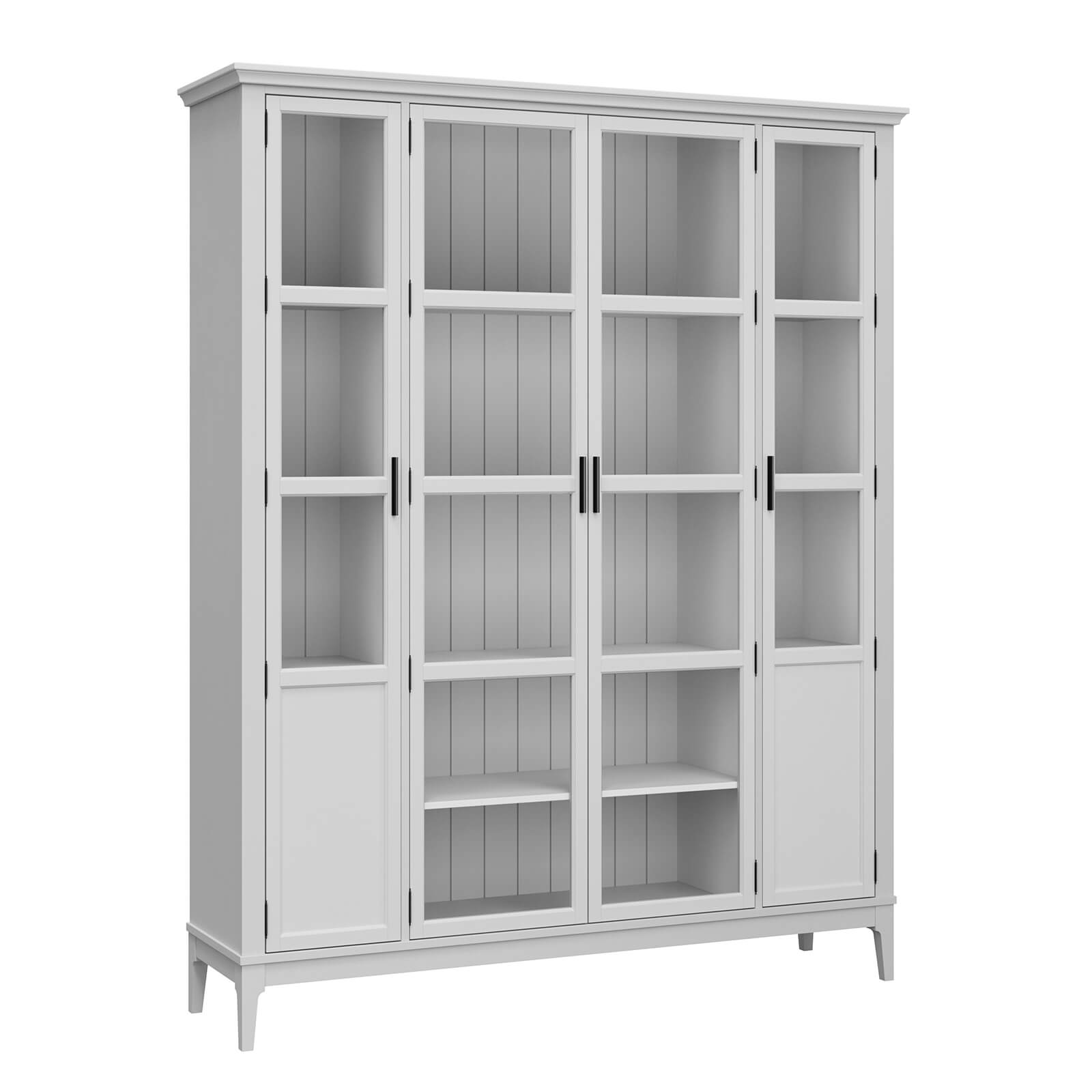 Это высокий шкаф с распашными, стеклянными дверями и четырьмя широкими полками и восемью узкими.