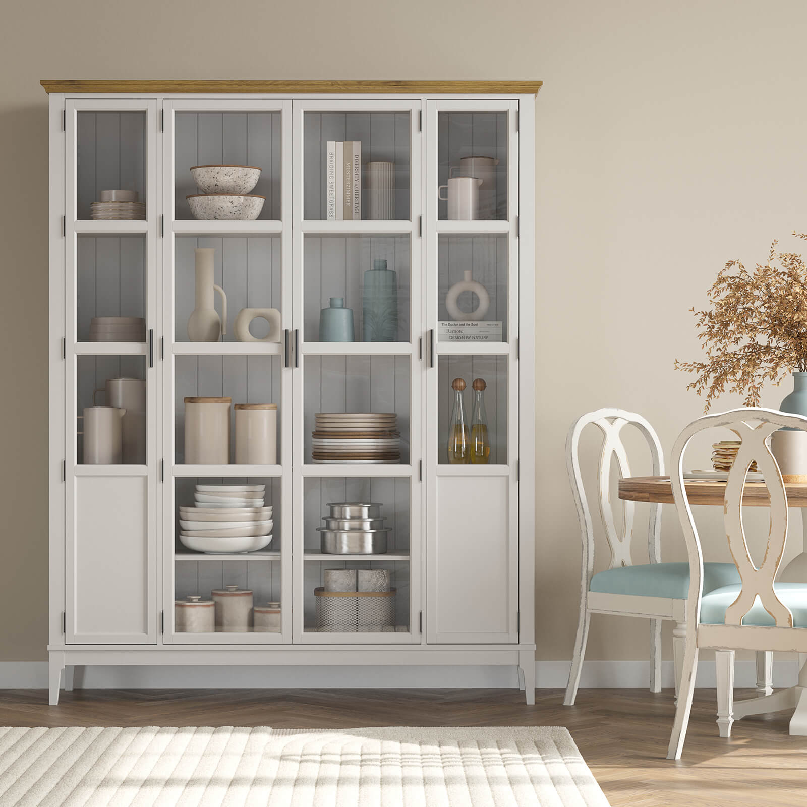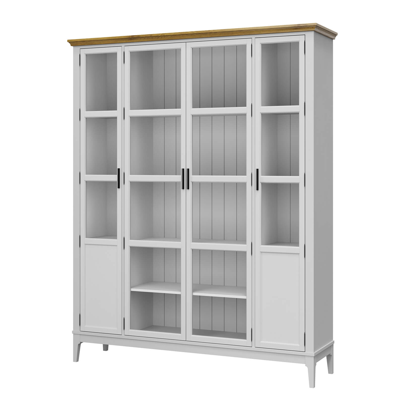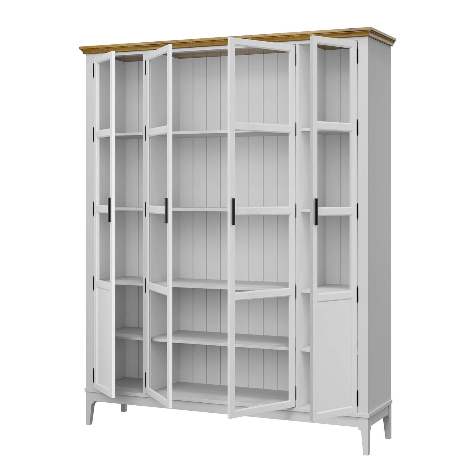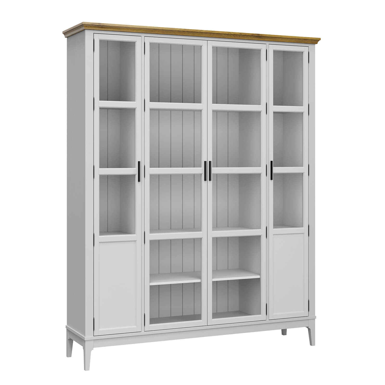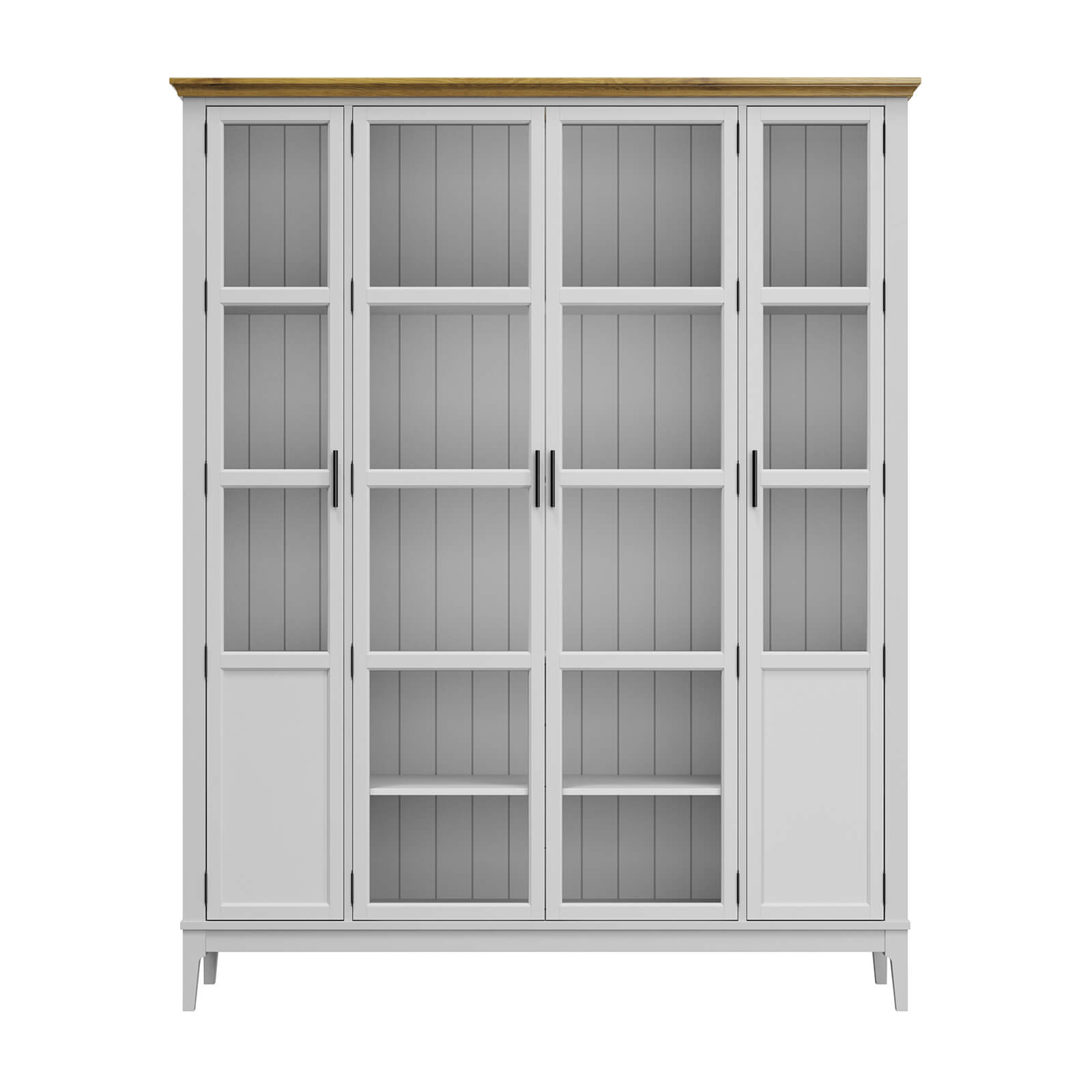 Это высокий шкаф с распашными, стеклянными дверями и четырьмя широкими полками и восемью узкими.