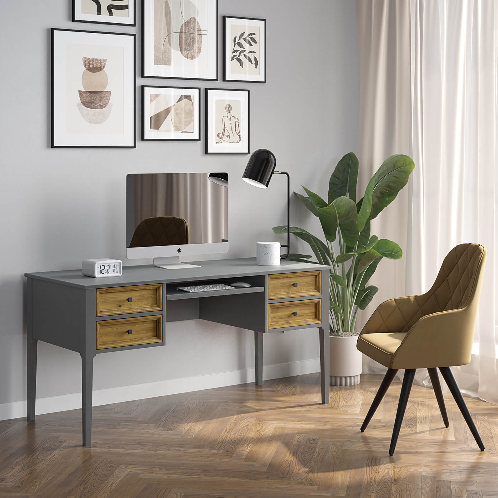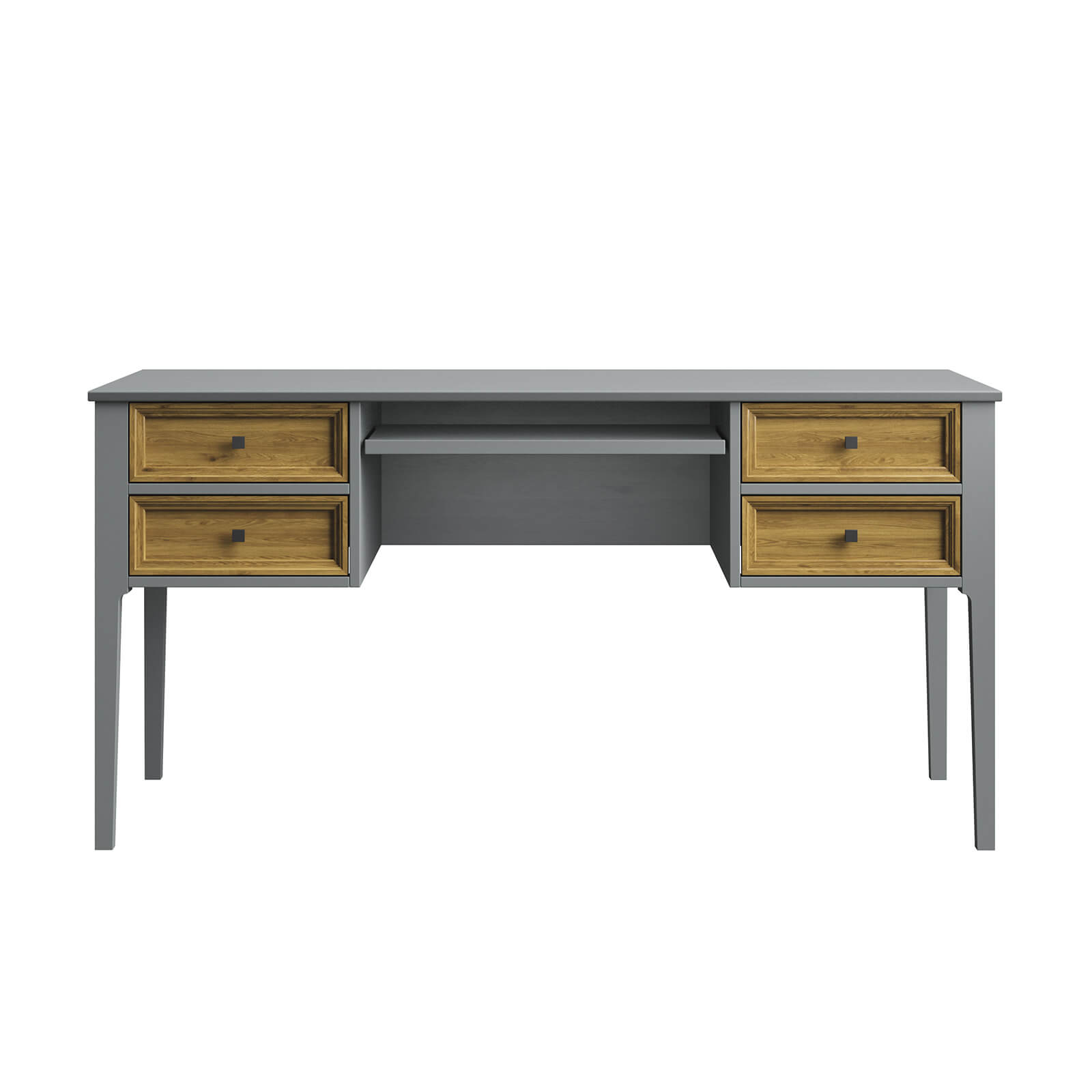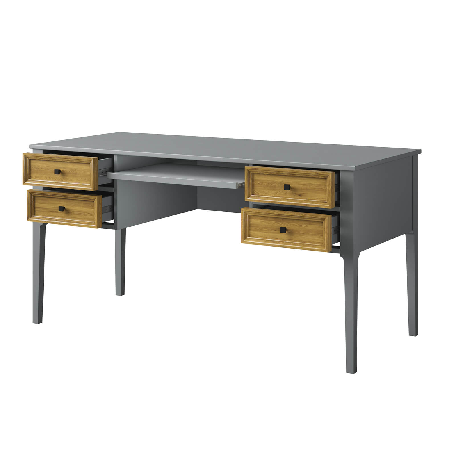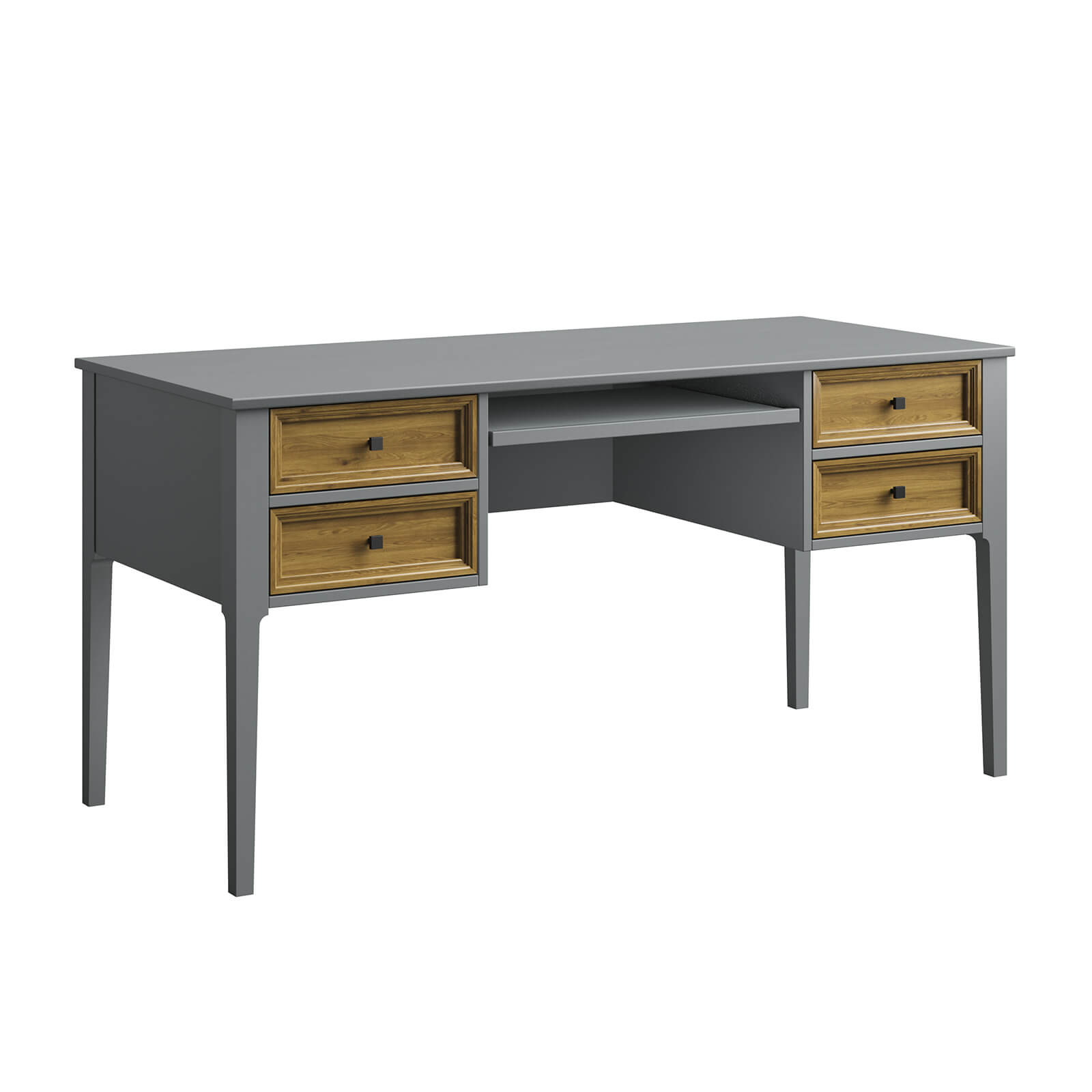 Классический стол из коллекции «Квадро-С». Широкая удобная столешница подойдет для работы за компьютером. Под ней расположено четыре выдвижных ящика и выдвижная полка для канцтоваров, документов и разных мелочей. Все детали сделаны из натурального массива дерева, что обеспечивает их прочность и надежность. Отличное приобретение для личного кабинета, гостиной или детской. Широкая столешница удобна как для рисования и другого ручного труда.