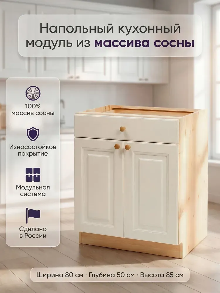 Тумба изготовлена из высококачественного мебельного щита толщиной 20 мм, прочного и долговечного. Задняя стенка и дно ящика сделаны из оргалита. Ящик на шариковых направляющих полного выдвижения, рассчитан на нагрузку до 25 кг. Дверные петли оснащены механизмом плавного доведения. Отделка УФ-лаком от крупного производителя The Sherwin-Williams Company (всё, кроме фасадов) и итальянским НЦ-лаком (фасады) придаёт шкафу элегантный и современный вид. В комплекте идут удобные деревянные ручки-кнопки. Столешницу можно заказать отдельно.