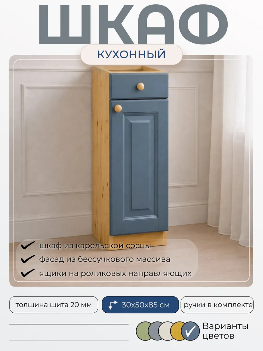 Тумба изготовлена из высококачественного мебельного щита толщиной 20 мм, прочного и долговечного. Задняя стенка и дно ящика сделаны из оргалита. Внутренне пространство тумбы разделено полкой. Ящик на шариковых направляющих полного выдвижения, рассчитан на нагрузку до 25 кг. Дверные петли оснащены механизмом плавного доведения. Отделка УФ-лаком от крупного производителя The Sherwin-Williams Company (всё, кроме фасадов) и итальянским НЦ-лаком (фасады) придаёт шкафу элегантный и современный вид. В комплекте идут удобные деревянные ручки-кнопки. Столешницу можно заказать отдельно.