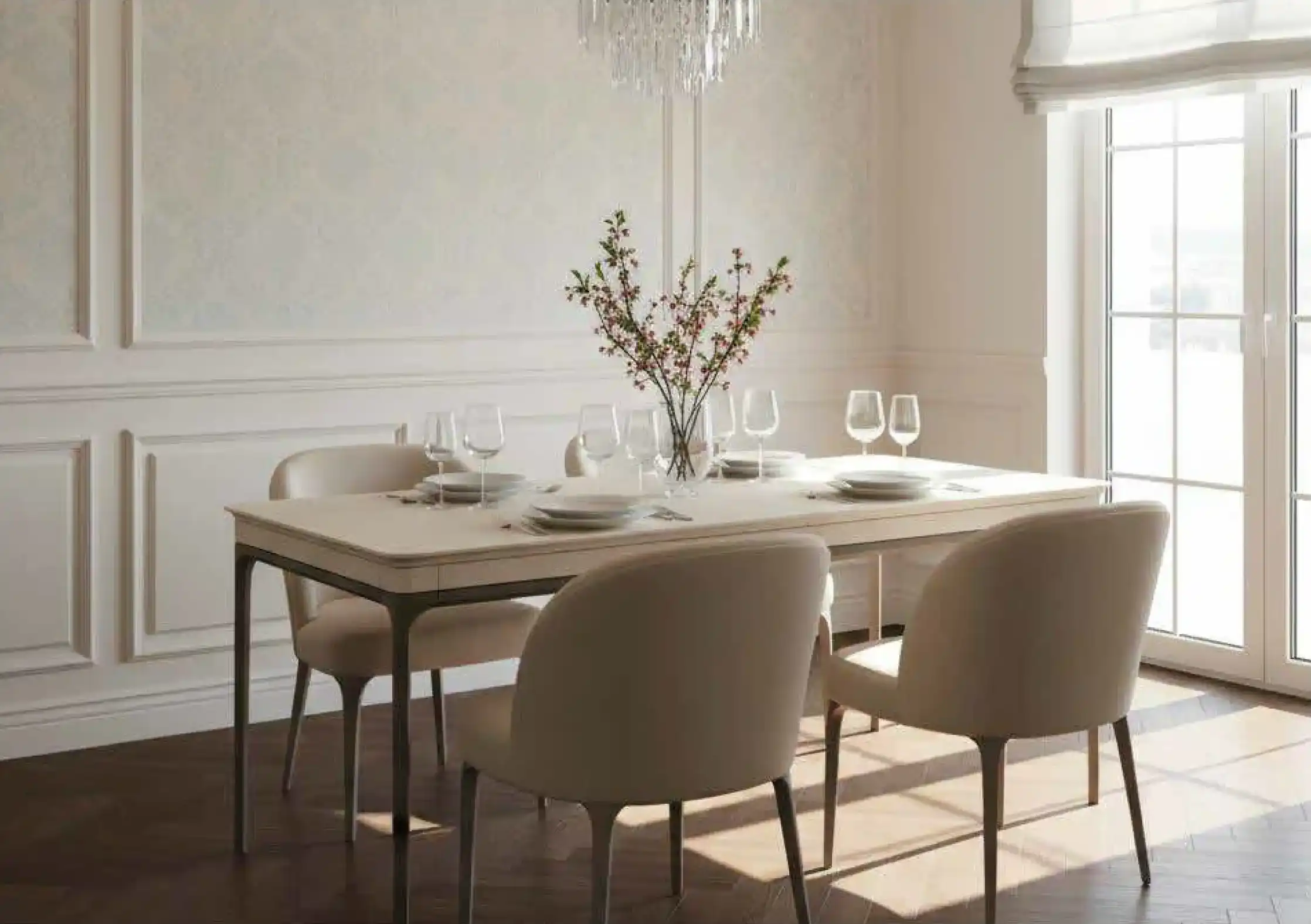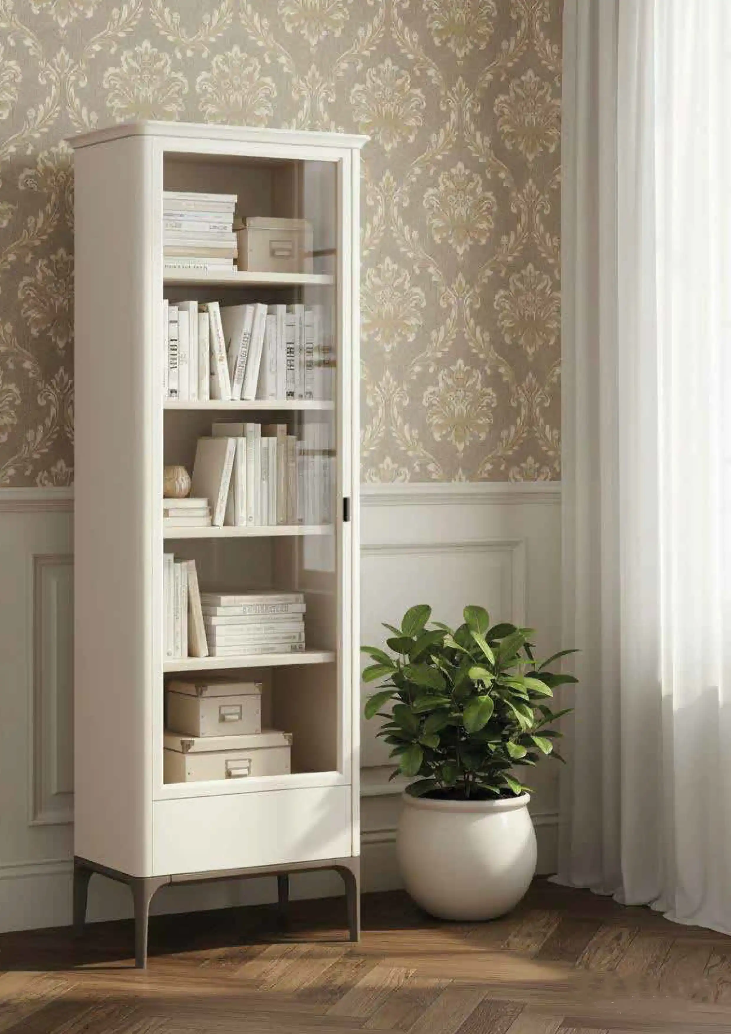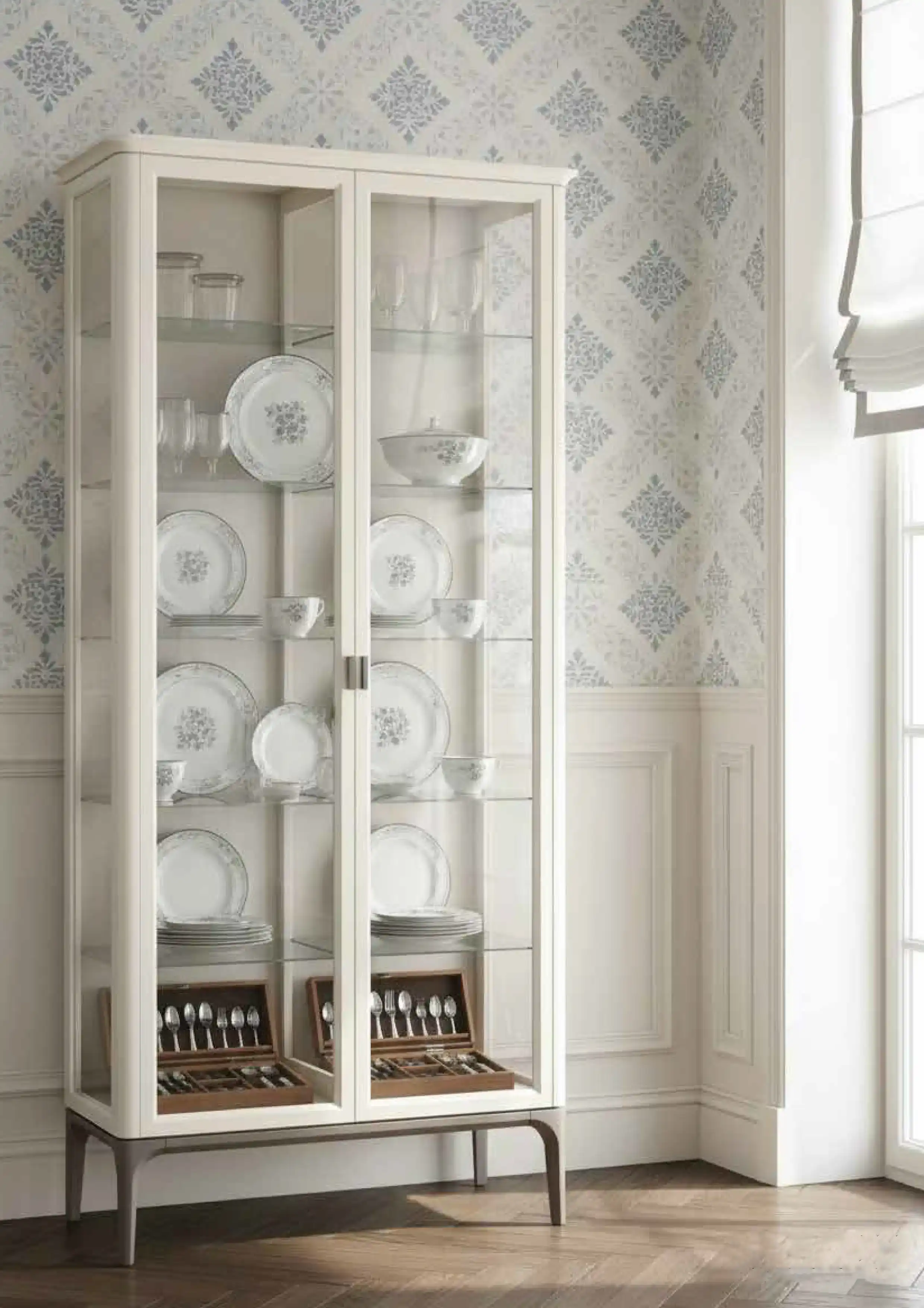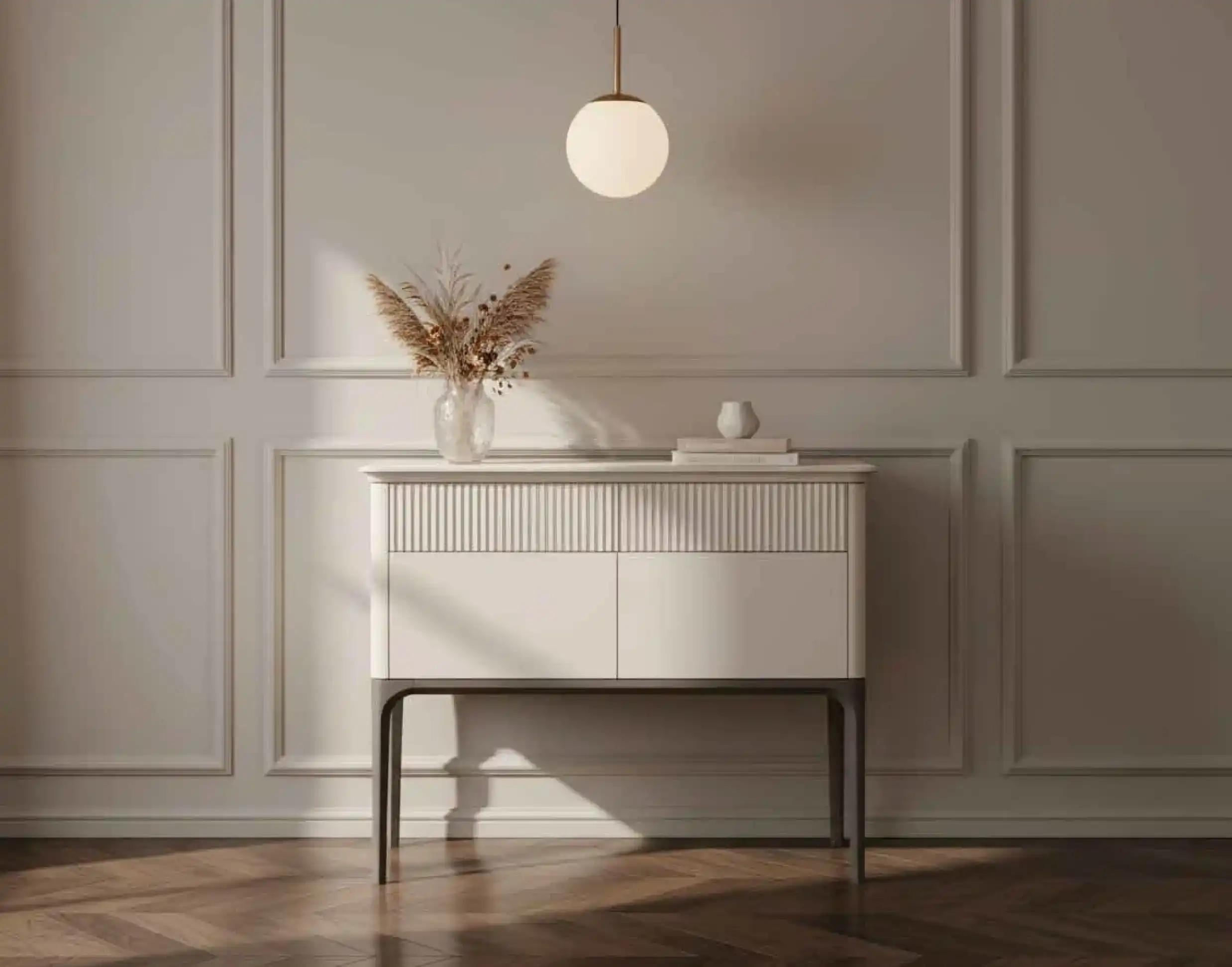 В базовом варианте мебель окрашивается в два цвета: корпус бежевый, а ножки коричневые. По запросу можно окрасить изделие в желаемые цвета от производителя: белый, молоко, слоновая кость, серо-бежевый, черный, сланцево-серый или другой (уточняйте при заказе). Фасады декорируются вертикальной фрезеровкой. Для мягкой мебели можно выбрать желаемую ткань (велюр, микровелюр, рогожка, букле, искусственная кожа).