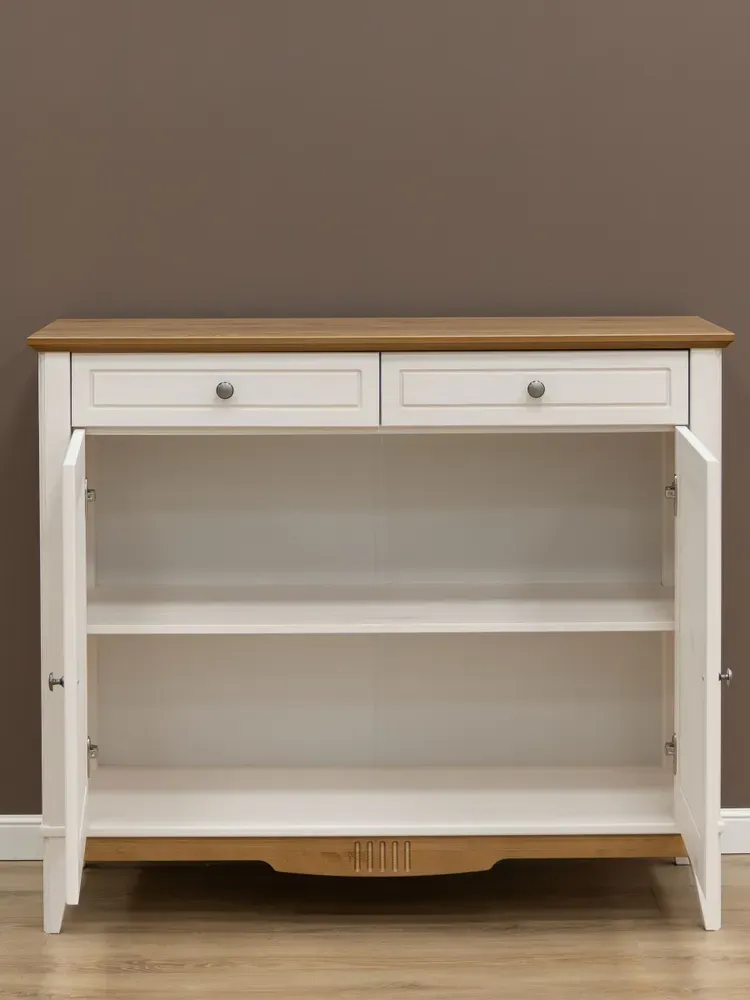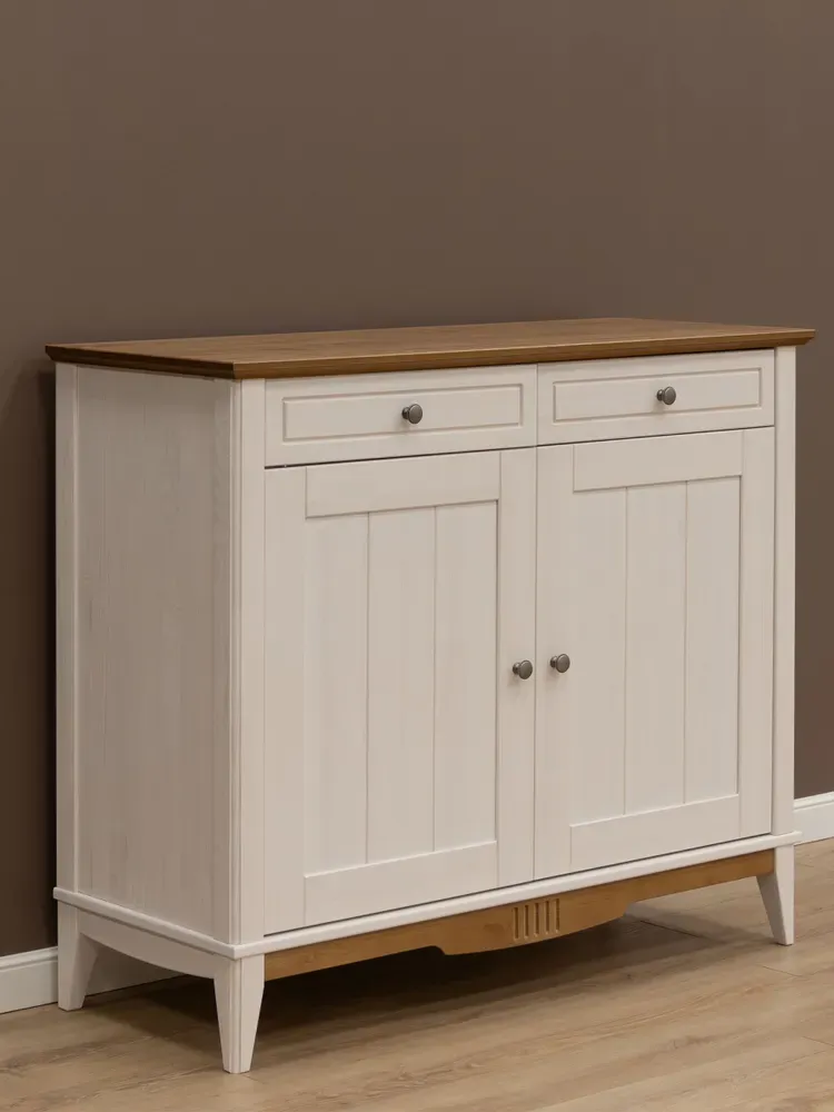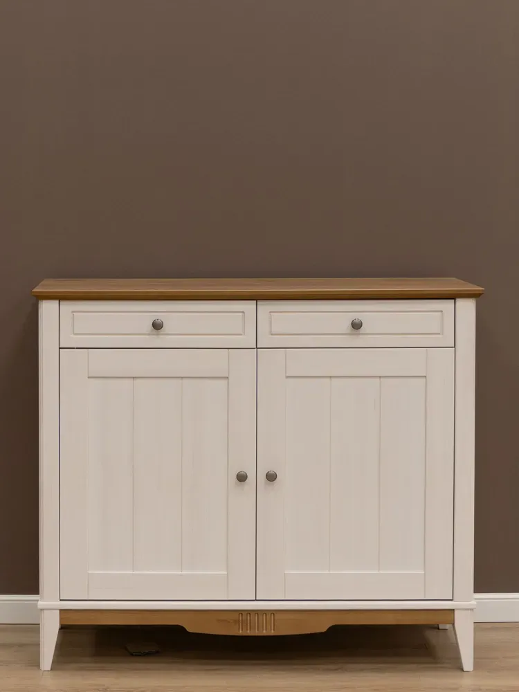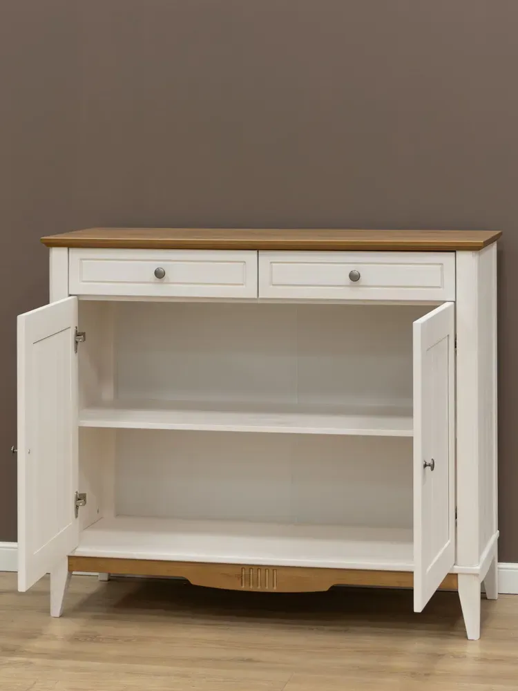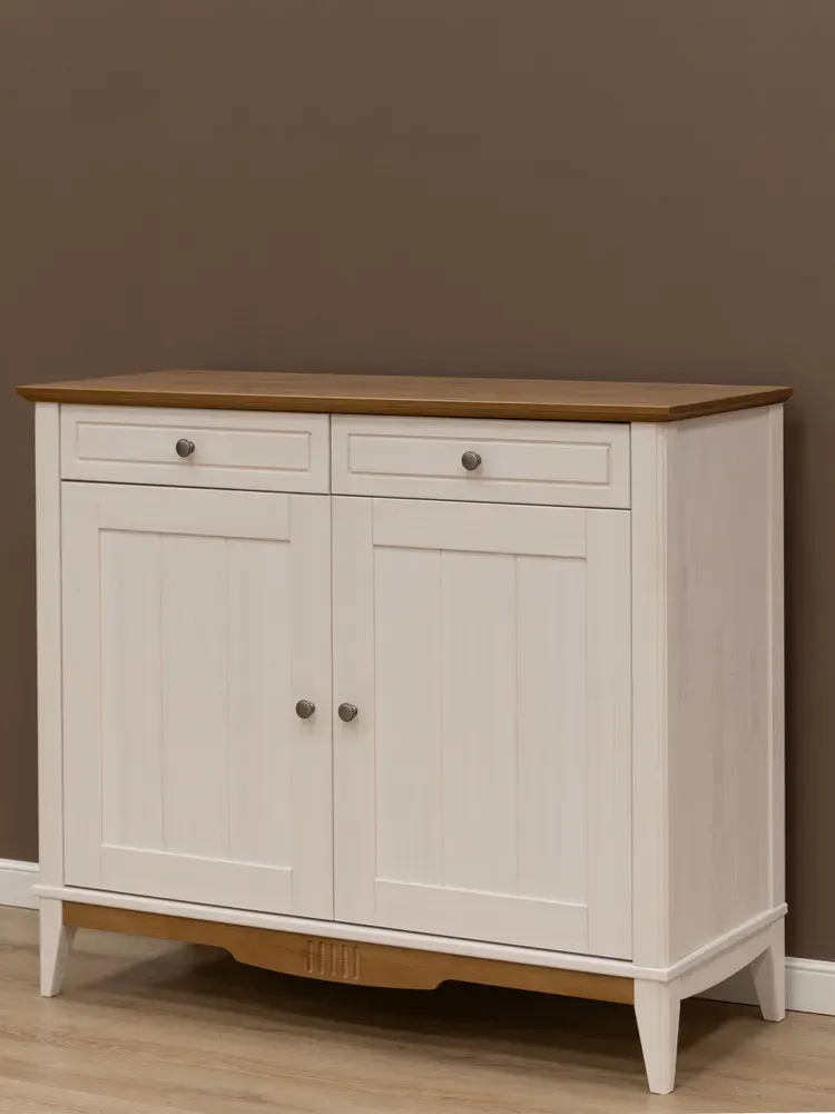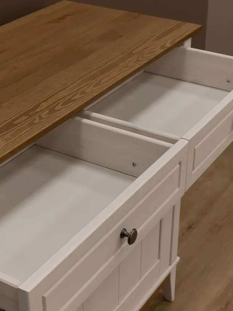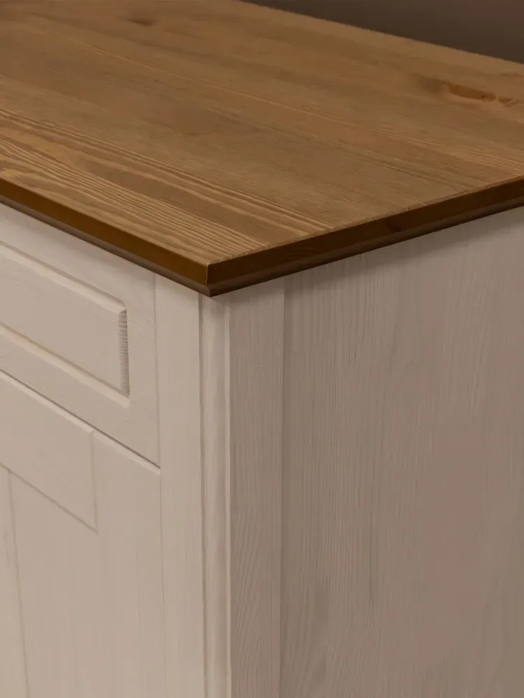 Корпус, фасады, полки и стенки ящиков комода окрашены в белый цвет, столешница и декоративная планка – в более живой цвет антик, через который виден природный рисунок древесины. Эта модель также доступна в отделках «серый/антик» и «черный/антик». Красители шведской компании Becker Acroma, применяемые для отделки, проходят строгую сертификацию, безопасны для здоровья, стойкие и долговечные. Фасады и нижняя планка с фрезеровкой, металлические ручки-кнопки с искусственным старением.