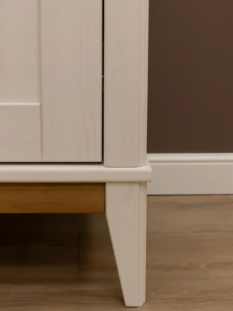 Корпус, фасады, полка, а также стенки ящиков изготовлены из натурального долговечного материала – массива сосны. Задняя стенка и днища ящиков из ДВП. Ящики комода устанавливаются на шариковых направляющих Hettich, без доводчиков. Дверцы навешиваются на петлях с доводчиками, закрываются без лишних звуков. За дверцами находится отделение со съемной полкой. Расстояние от пола до нижней декоративной планки комода составляет 12 см, в это пространство свободно пройдет робот-пылесос для уборки.