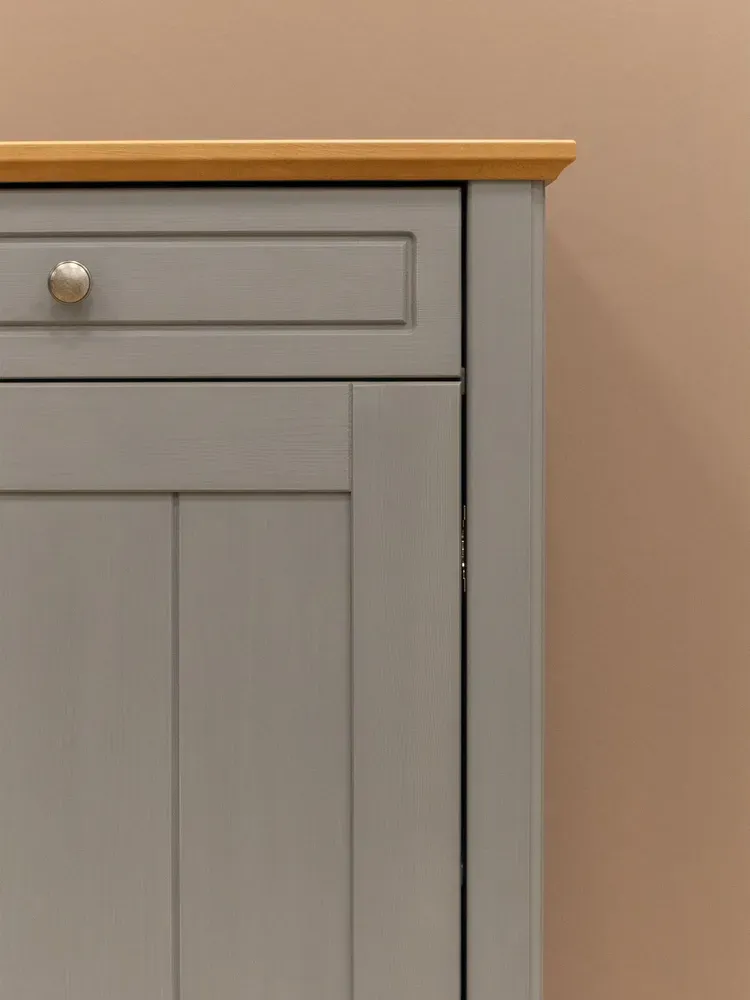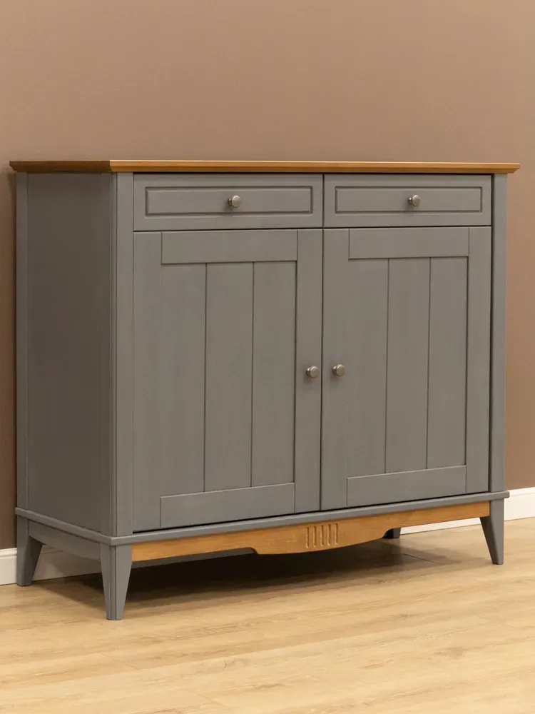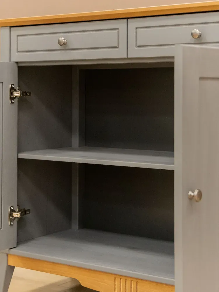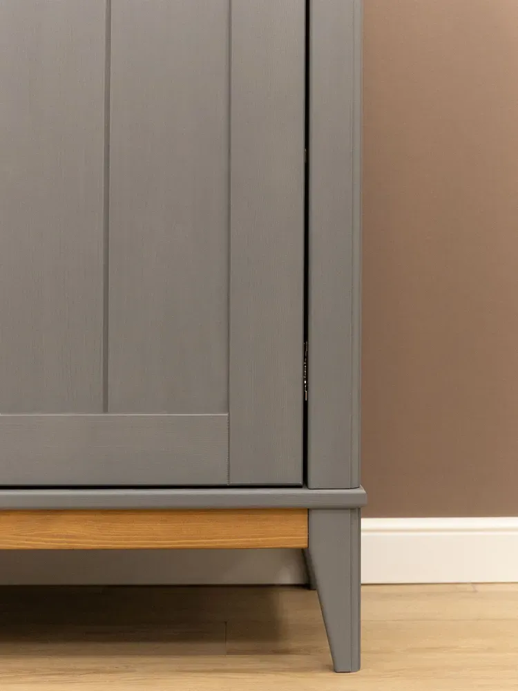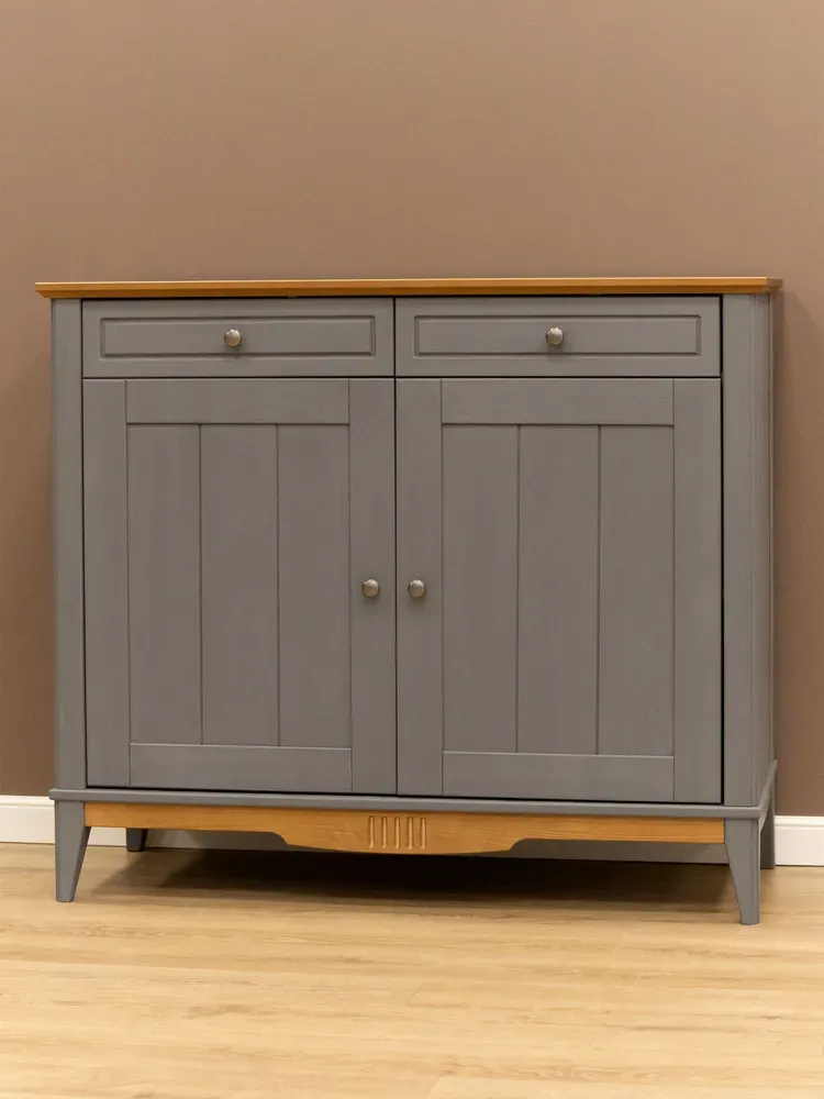 Корпус, фасады, полки и стенки ящиков комода окрашены в спокойный серый цвет, столешница и декоративная планка – в более живой цвет антик, через который виден природный рисунок древесины. Эта модель также доступна в отделках «белый воск/антик» и «черный/антик». Красители шведской компании Becker Acroma, применяемые для отделки, проходят строгую сертификацию, безопасны для здоровья, стойкие и долговечные. Фасады и нижняя планка с фрезеровкой, металлические ручки-кнопки с искусственным старением.