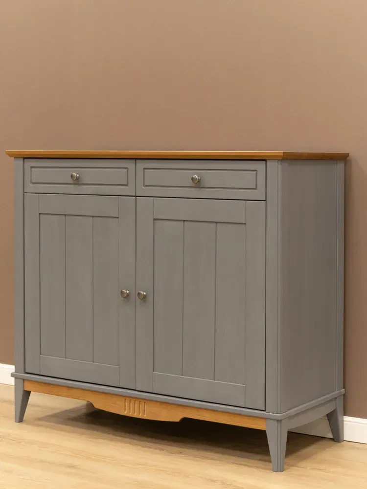 Комод буфета «Пенни» с 2 дверцами и 2 ящиками из натурального дерева выполнен в популярном сегодня скандинавском стиле. Это универсальный предмет для кухни или гостиной. Можно установить на комод надстройку «Пенни» и создать полноценный буфет с нишей, либо использовать его отдельно, как кухонный модуль. Двухдверный комод разработан и произведен в сотрудничестве белорусской фабрикой ММЦ, немецкими дизайнерами и российской компанией «ДМС-маркет».