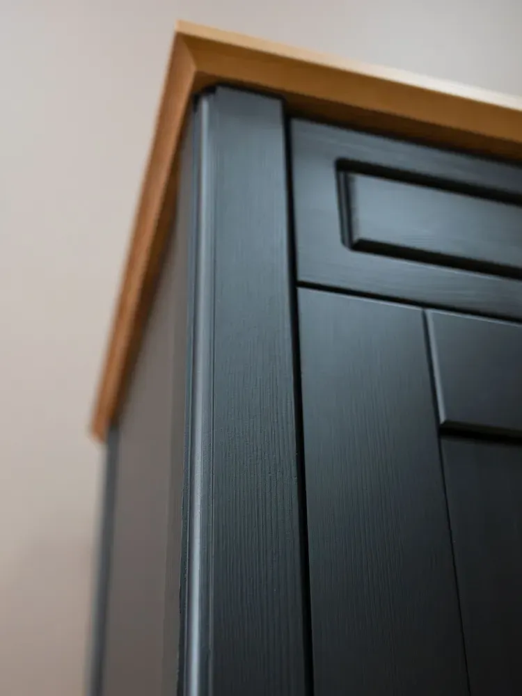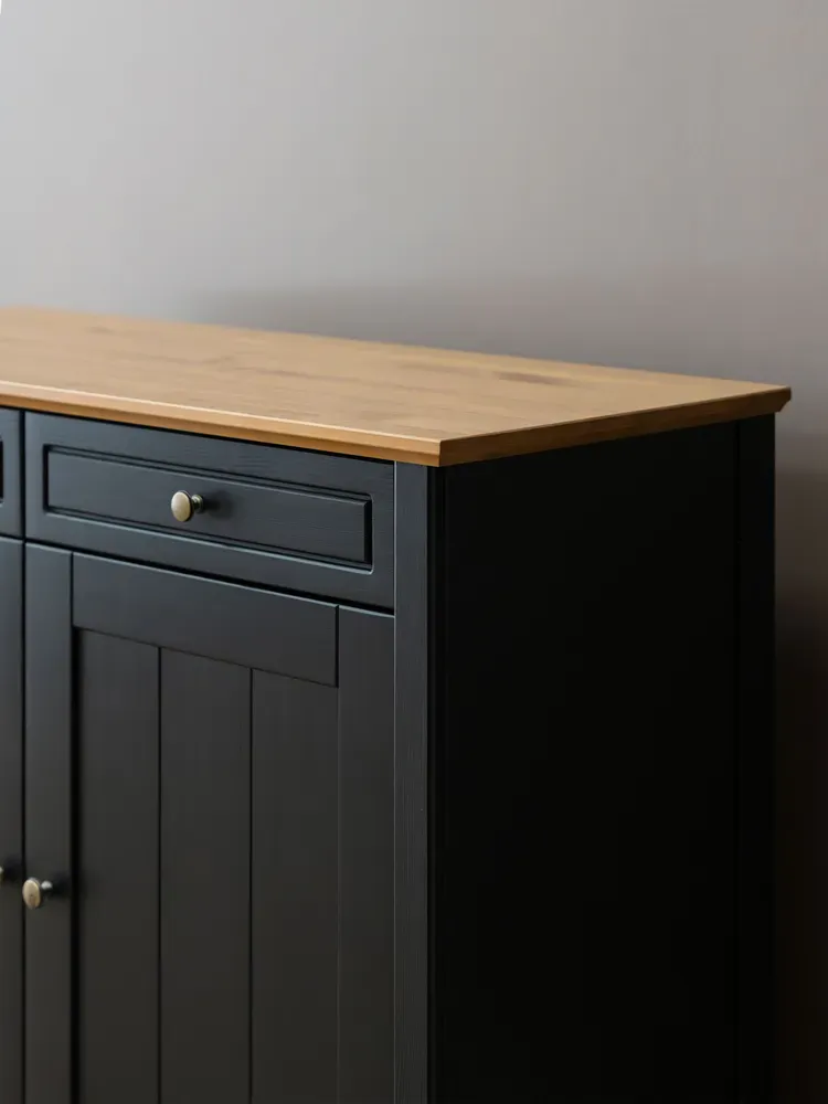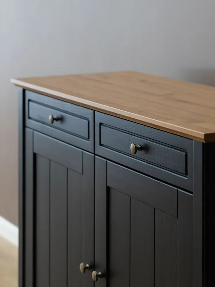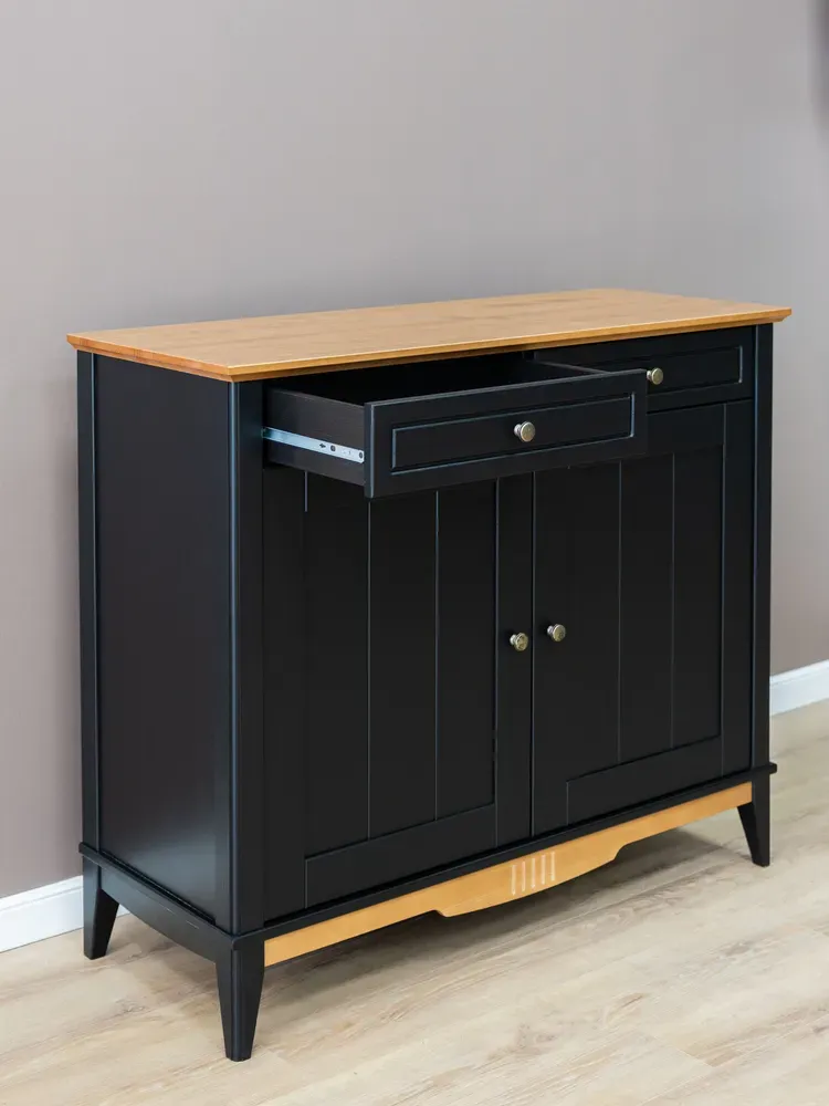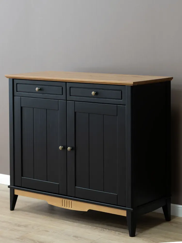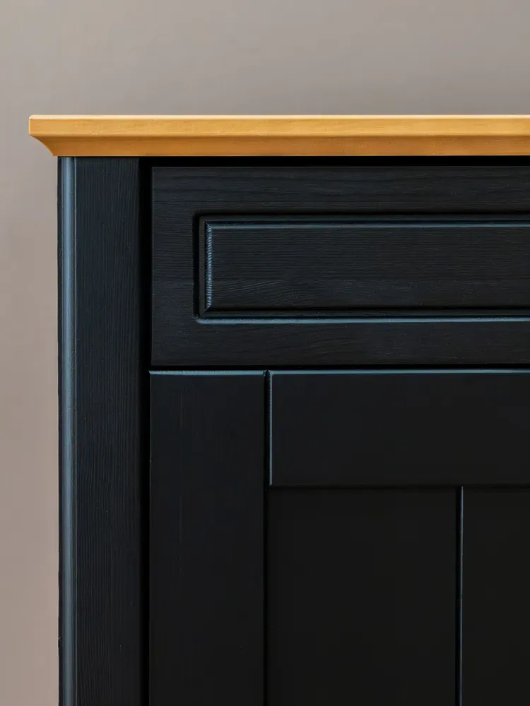 Корпус, фасады, полки и стенки ящиков комода окрашены в черный цвет, столешница и декоративная планка – в более живой цвет антик, через который виден природный рисунок древесины. Эта модель также доступна в отделках «белый воск/антик» и «черный/антик». Красители шведской компании Becker Acroma, применяемые для отделки, проходят строгую сертификацию, безопасны для здоровья, стойкие и долговечные. Фасады и нижняя планка с фрезеровкой, металлические ручки-кнопки с искусственным старением.