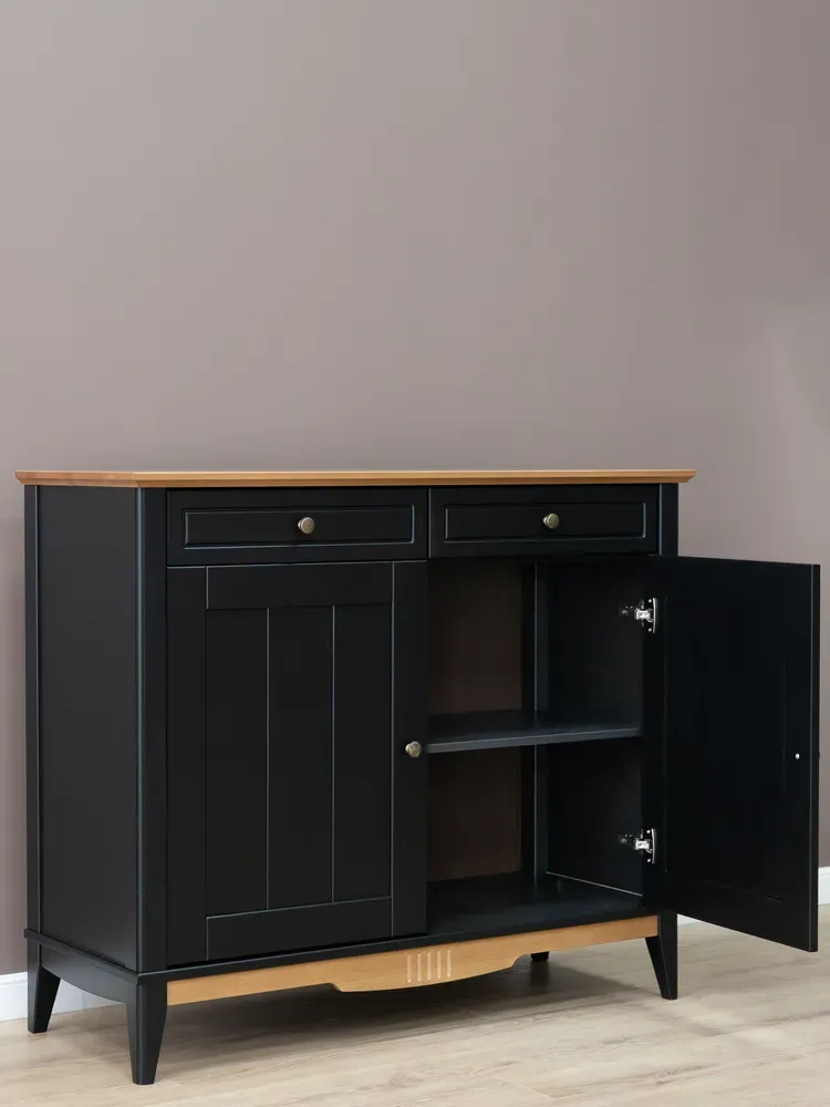 Комод буфета «Пенни» с 2 дверцами и 2 ящиками из натурального дерева выполнен в популярном сегодня скандинавском стиле. Это универсальный предмет для кухни или гостиной. Можно установить на комод надстройку «Пенни» и создать полноценный буфет с нишей, либо использовать его отдельно, как кухонный модуль. Двухдверный комод разработан и произведен в сотрудничестве белорусской фабрикой ММЦ, немецкими дизайнерами и российской компанией «ДМС-маркет».