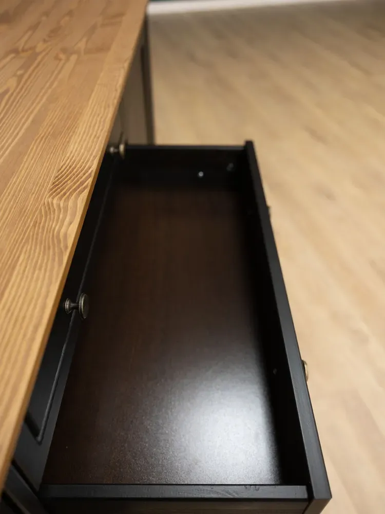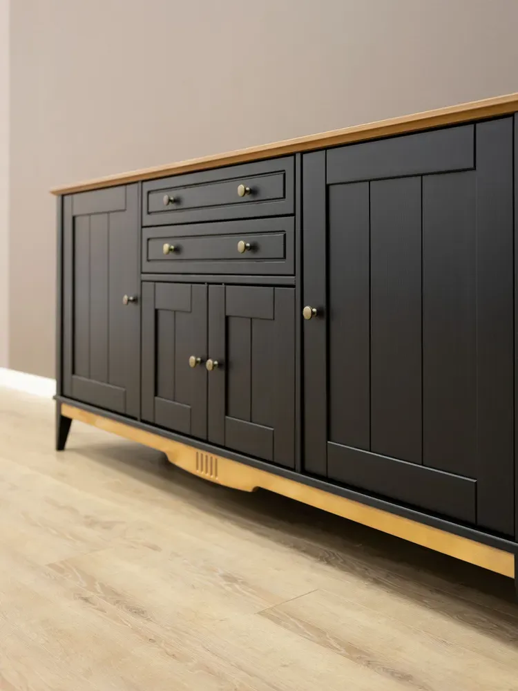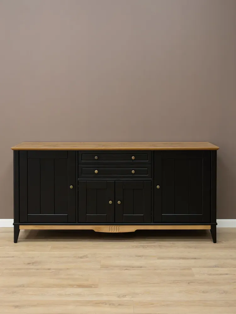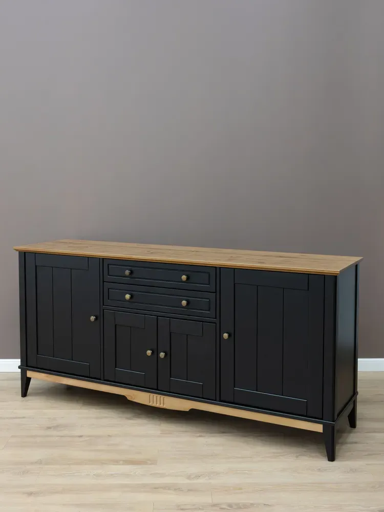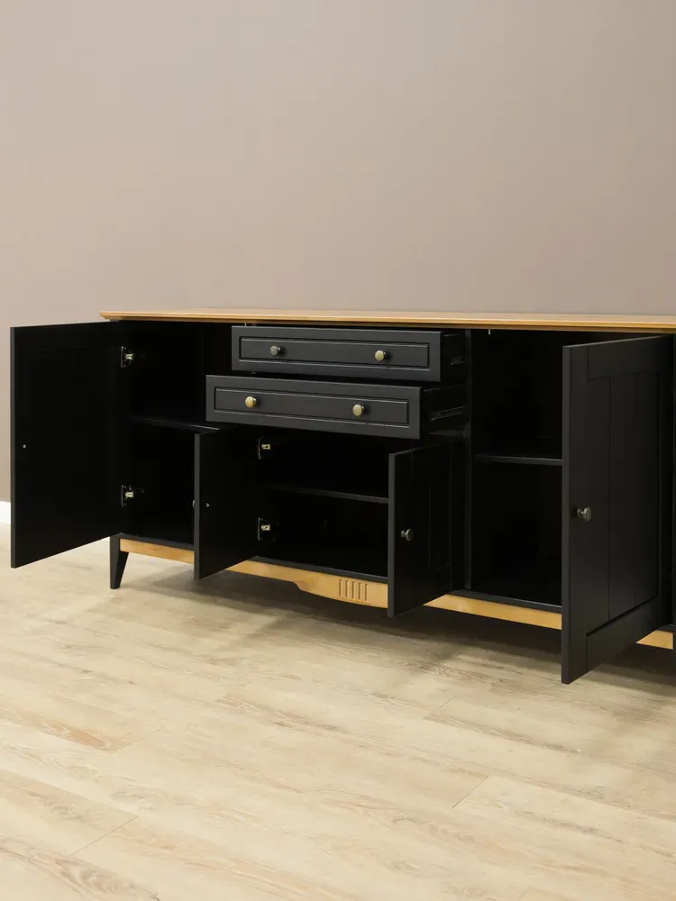 У этой модели комода четыре распашные дверцы и два выдвижных ящика. Донья ящиков изготовлены из прочного белого оргалита, стенки из массива сосны, окрашены в цвет корпуса. Для ящиков предусмотрены шариковые направляющие частичного выдвижения, без доводчиков. Дверцы навешиваются на петлях с доводчиками, закрываются без усилий и бесшумно. Высота от пола до нижнего края планки 12 см, уборку под тумбой можно делать с помощью робота-пылесоса.