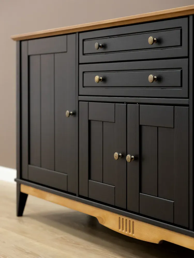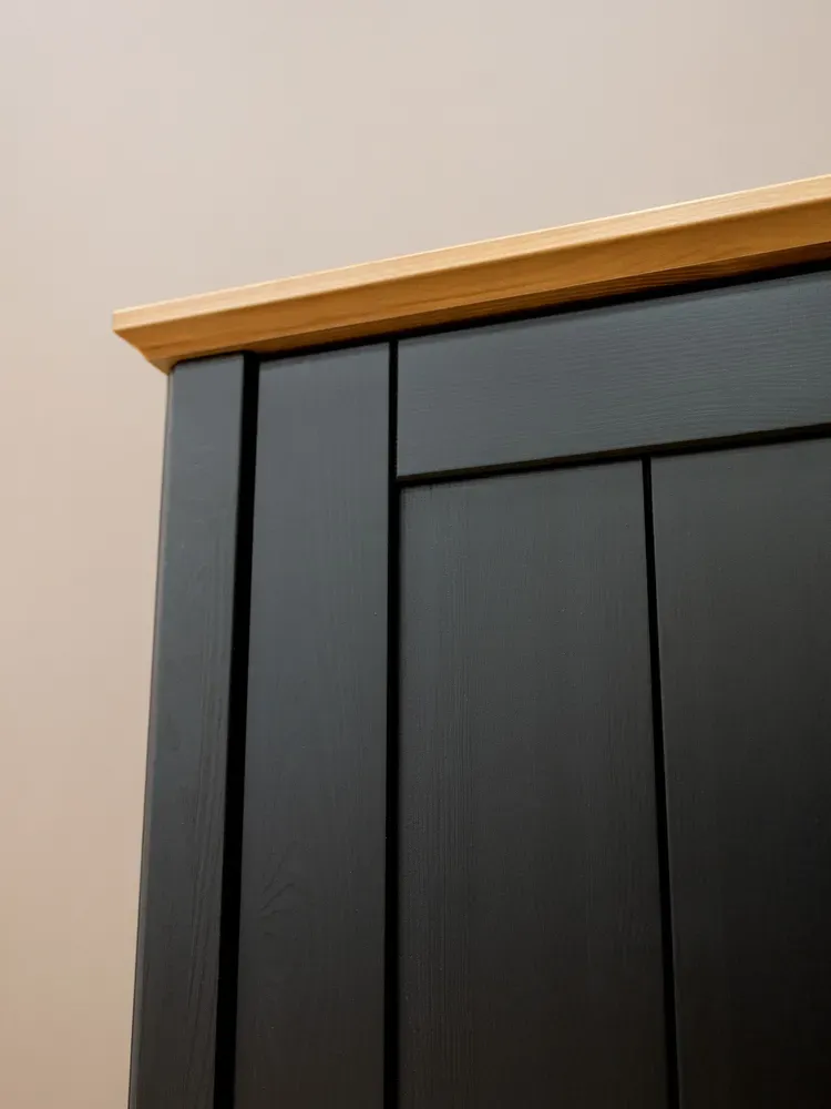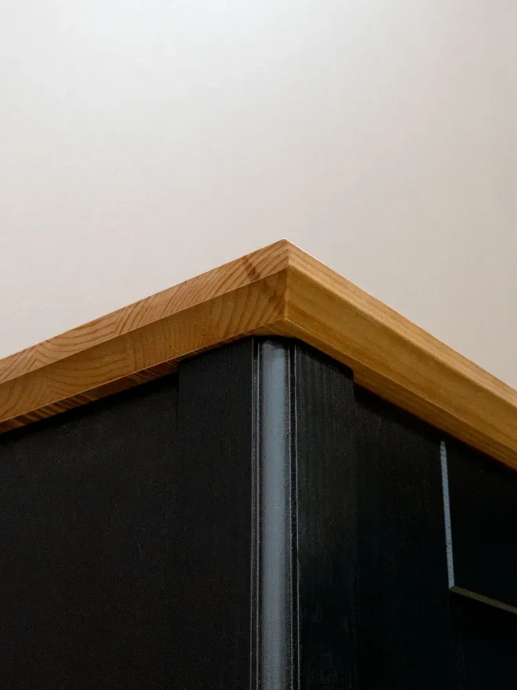 Корпус и фасад комода окрашены в черный цвет, крышка и нижняя декоративная планка – в цвет антик. Эта модель комода также доступна в сочетаниях цветов «белый воск/антик» и «серый/антик». Для окрашивания применяются материалы шведской фирмы Becker Acroma: стойкие, без резких запахов, безопасные для здоровья. Фасады и нижняя планка украшены декоративной фрезеровкой, ручки из металла с искусственным старением.