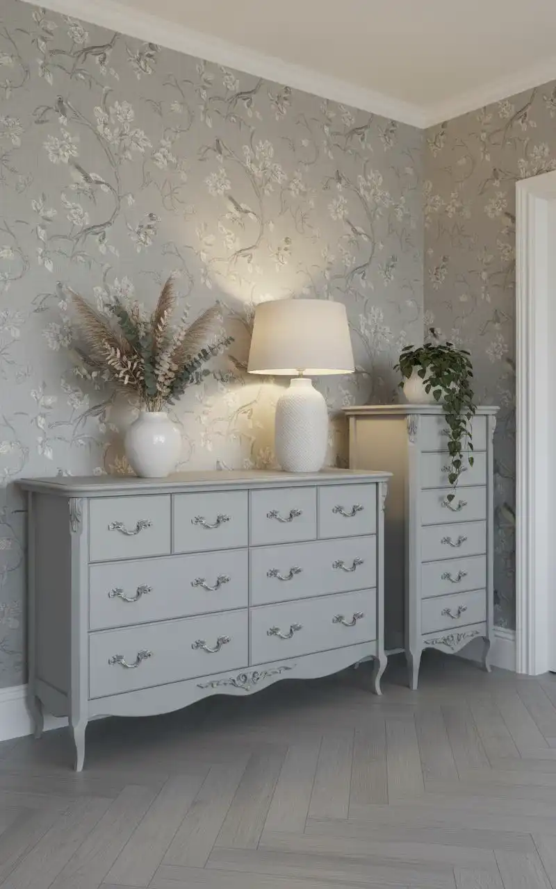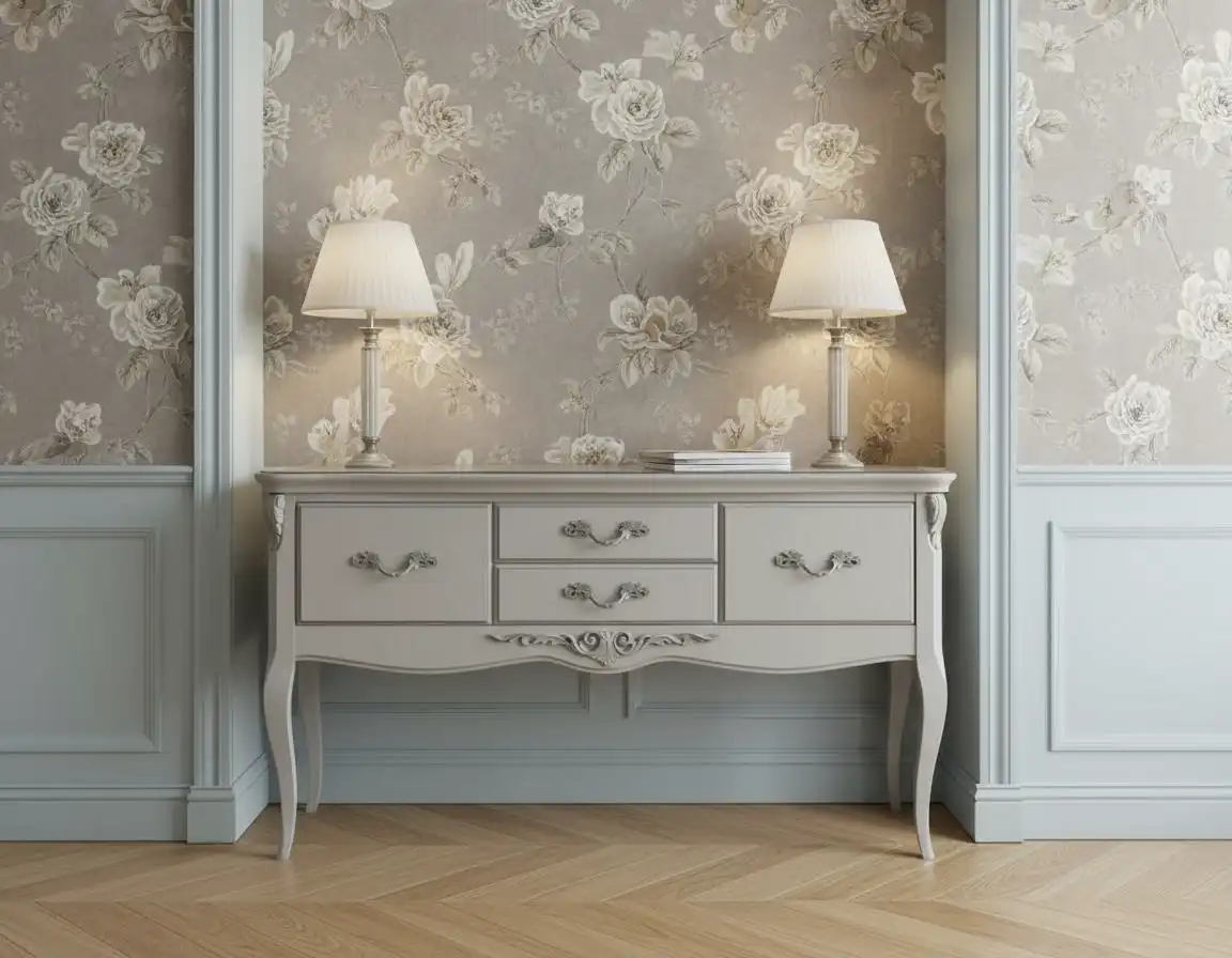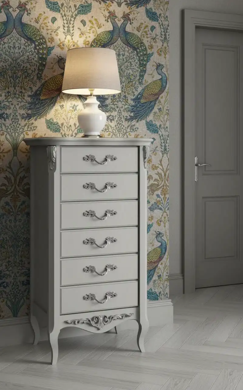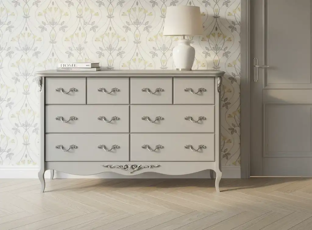 Базовый цвет отделки – серо-бежевый с серебряной патиной. Но мебель может быть выкрашена и в другие цвета: белый, серый, бежевый, черный, шоколад, розовая пудра, серо-коричневый слоновая кость и т. д. Фасады декорируются филенками и узорными накладками из полиуретана. Мягкая обивка украшается каретной стяжкой, донья ящиков – с покрытием из микровельвета. На ящиках и дверцах металлические ручки-скобы с декоративными накладками.