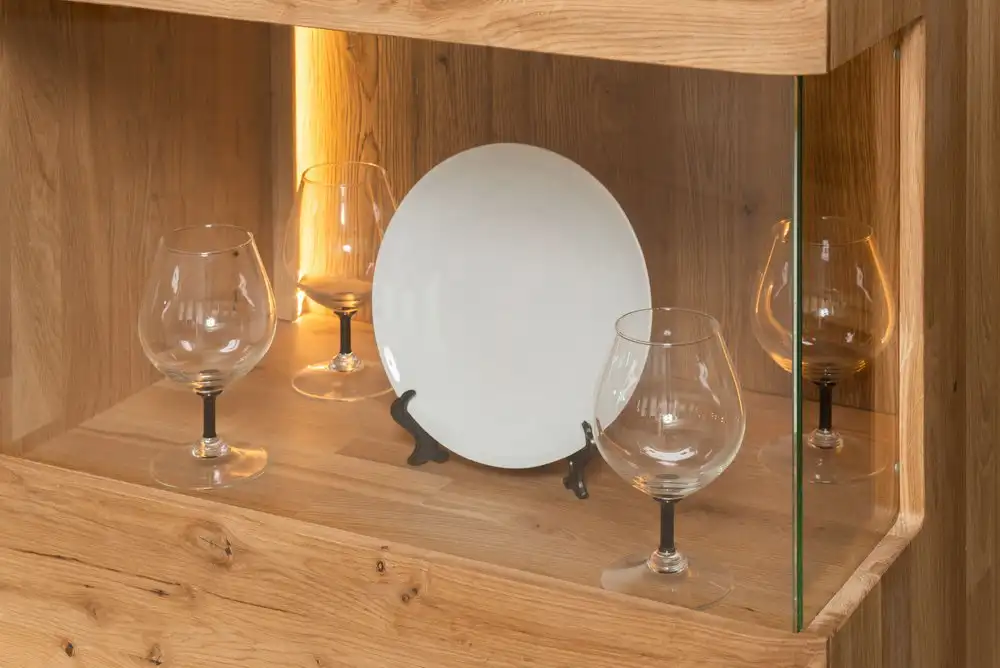 Для изготовления корпусов и фасадов используется качественный сортированный массив дуба, задние стенки выполняются из фанеры в дубовом шпоне. Фасады без выступающих ручек. В дверных петлях и в направляющих для ящиков предусмотрены механизмы плавного доведения. В остекленных шкафах есть встроенная подсветка.