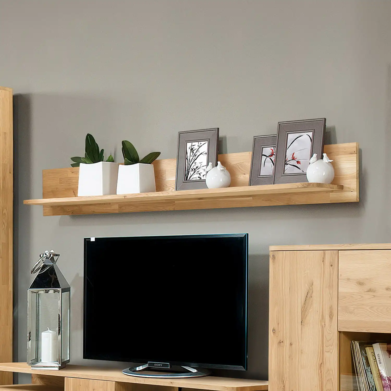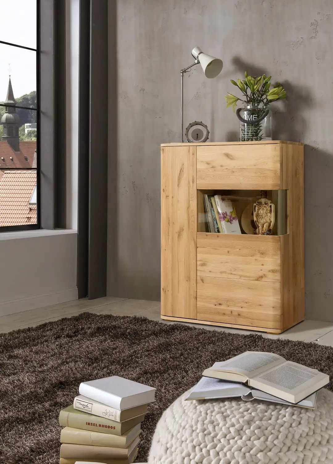 Мебель из дуба для гостиной «Милтон» отличается приятными для глаз скругленными линиями, надежными конструкциями и интересными цветами, которые не скрывают природную поверхность дерева. В коллекции есть шкафы с витринами разной конструкции, комод, тумба ТВ, журнальный стол, настенная полка.