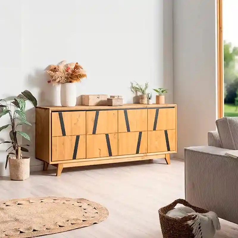 Мебель «Мэнсон» запоминается своим интересным дизайном с черными наклонными полосами. В коллекции есть обеденный стол, журнальный столик и комоды с дверцами и ящиками.