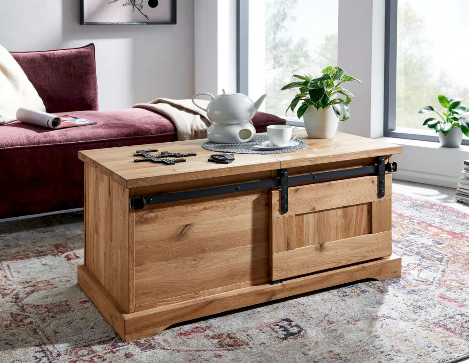 Корпуса и фасады производятся из отборного массива дуба. Задние стенки изготавливаются из фанеры в отделке дубовым шпоном. Предметы имеют сдвижные дверцы с декоративными металлическими накладками крест накрест. За дверцами расположены отделения с полками. Ящики устанавливаются на шариковые направляющие с доводчиками для плавного закрывания. На ящиках фрезерованные ручки.