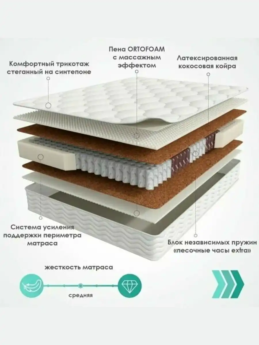 • 5-зональный пружинный блок «Песочные часы Extra» — 550 пружин/м² точно адаптируются под изгибы тела, обеспечивая анатомическую поддержку позвоночника.
