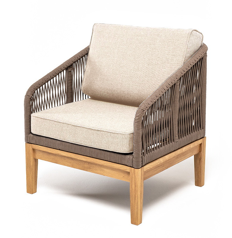 "Канны" кресло плетеное из роупа, основание дуб, роуп коричневый круглый, ткань бежевая 15052