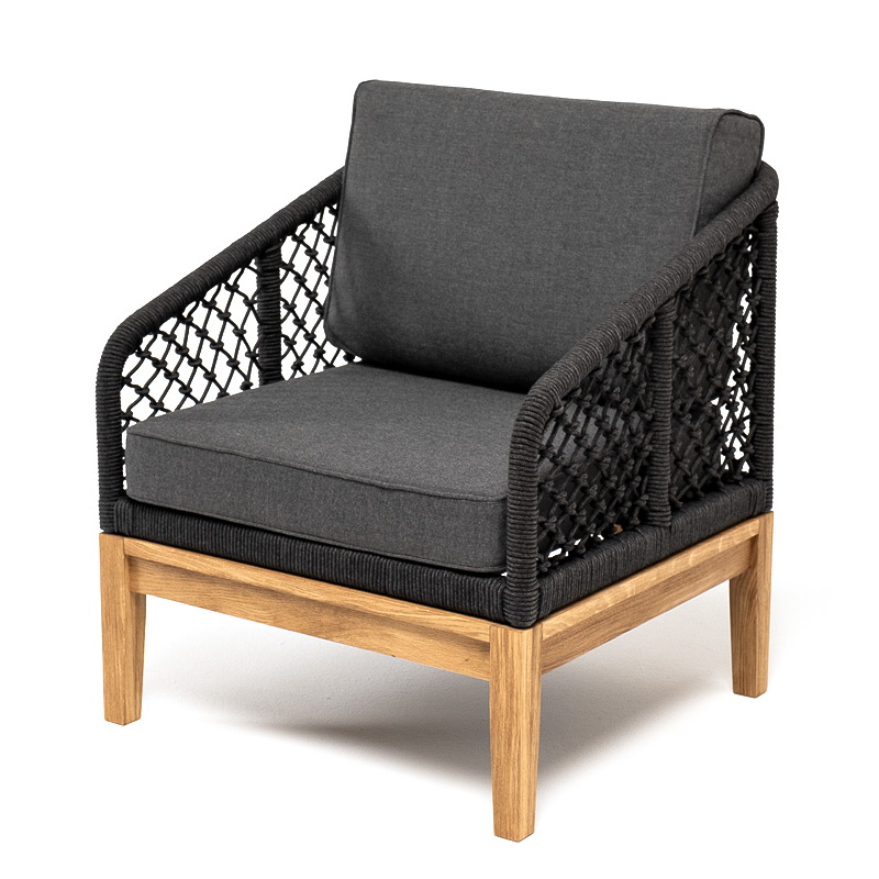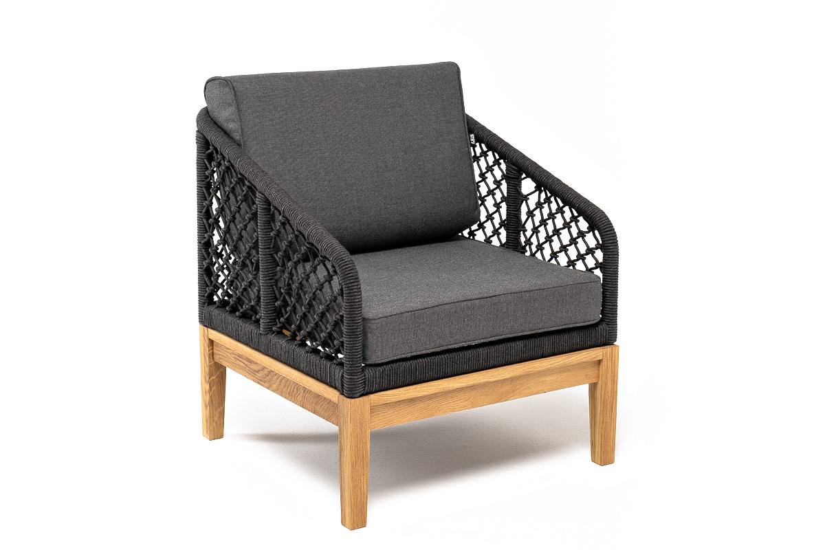 "Канны" кресло плетеное из роупа (узелки), основание дуб, роуп темно-серый круглый, ткань темно-серая 027