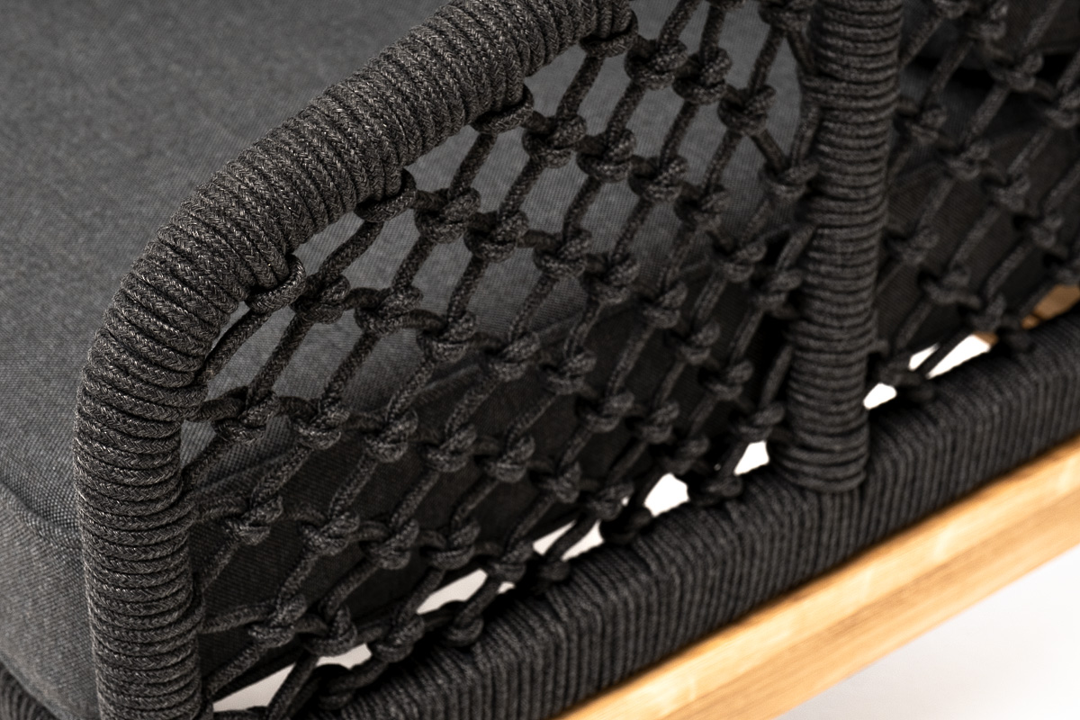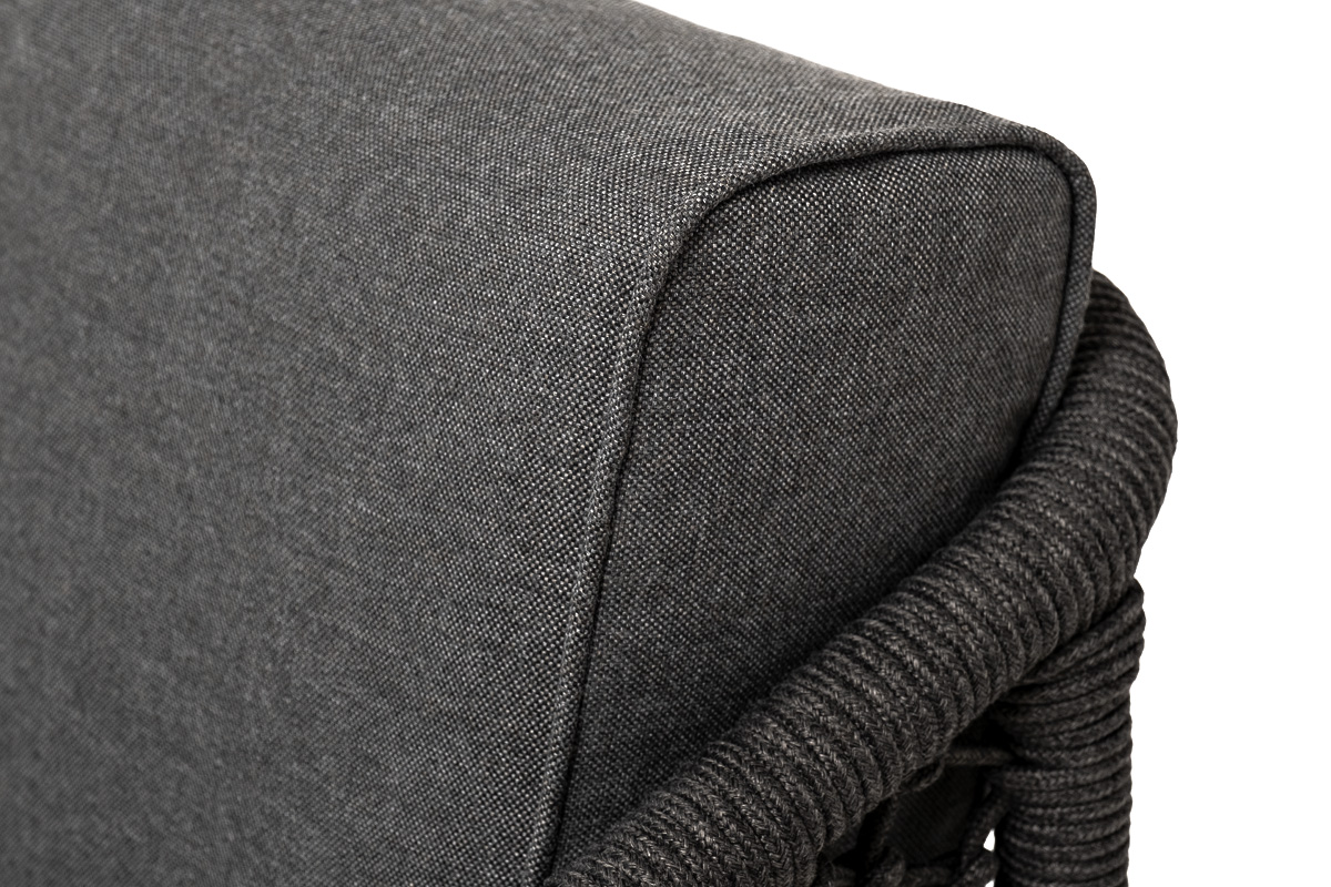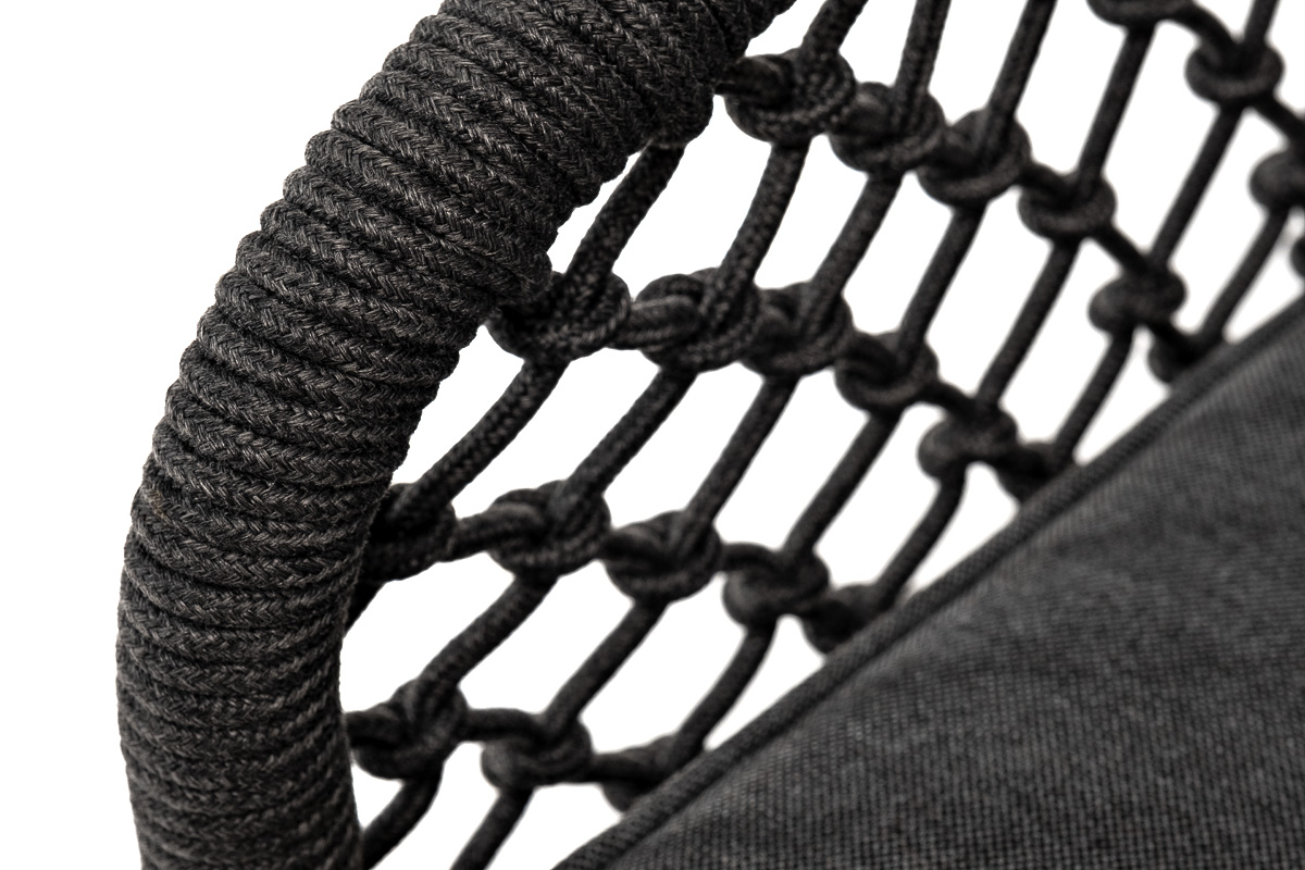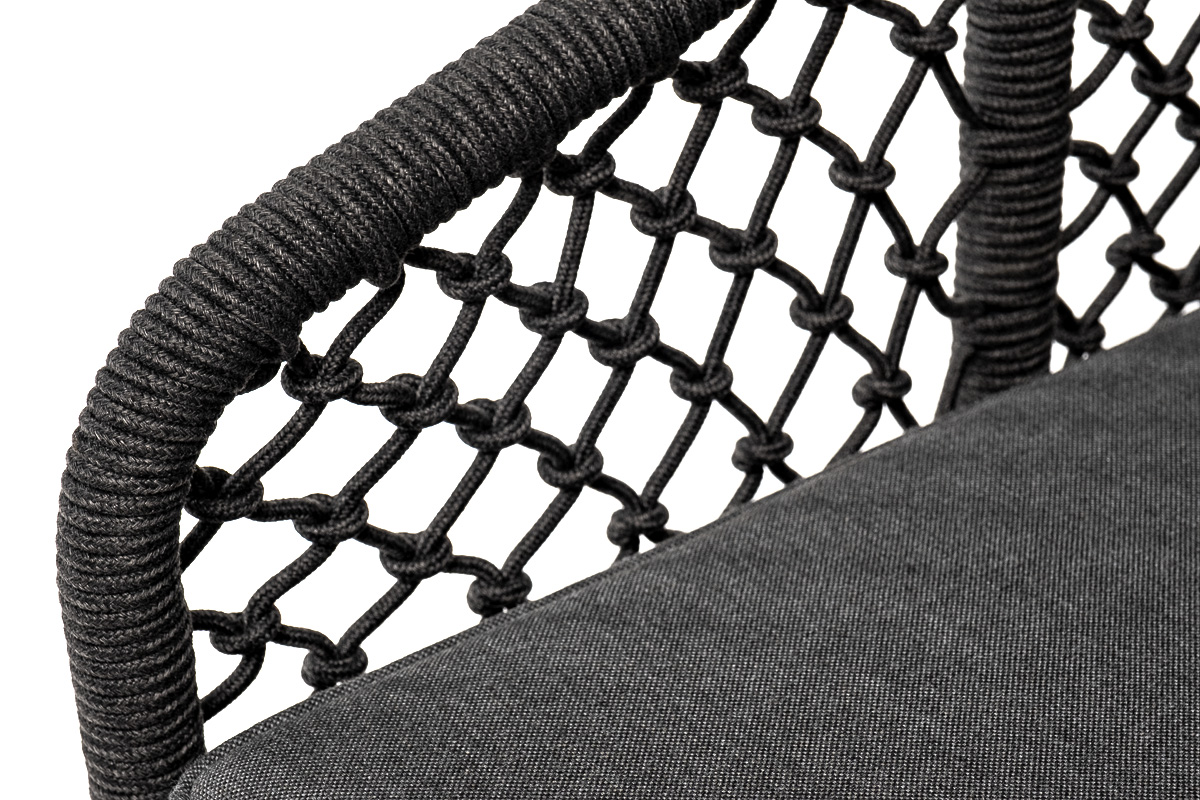 Кресло «Канны» с узловым плетением из роупа идеально подходит для комфортного отдыха в саду или на веранде. На боковинах - оплетка из синтетических лент, выполненных из полиэфирных волокон высокой прочности. Цвет плетения - темно-серый. Вид плетения - узелковый, создавался вручную. Основание - дуб. Приятное дополнение − подушки со съёмными чехлами темно-серого цвета. Размеры плетеного кресла: 700×700×810 мм.