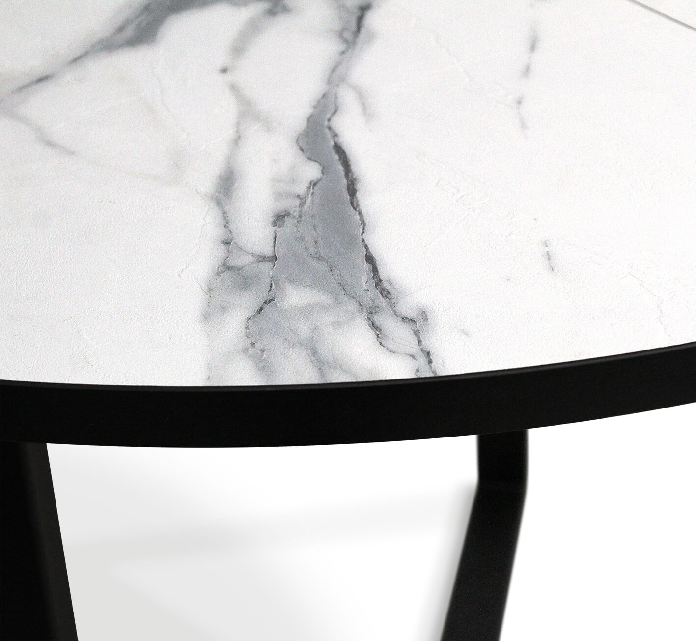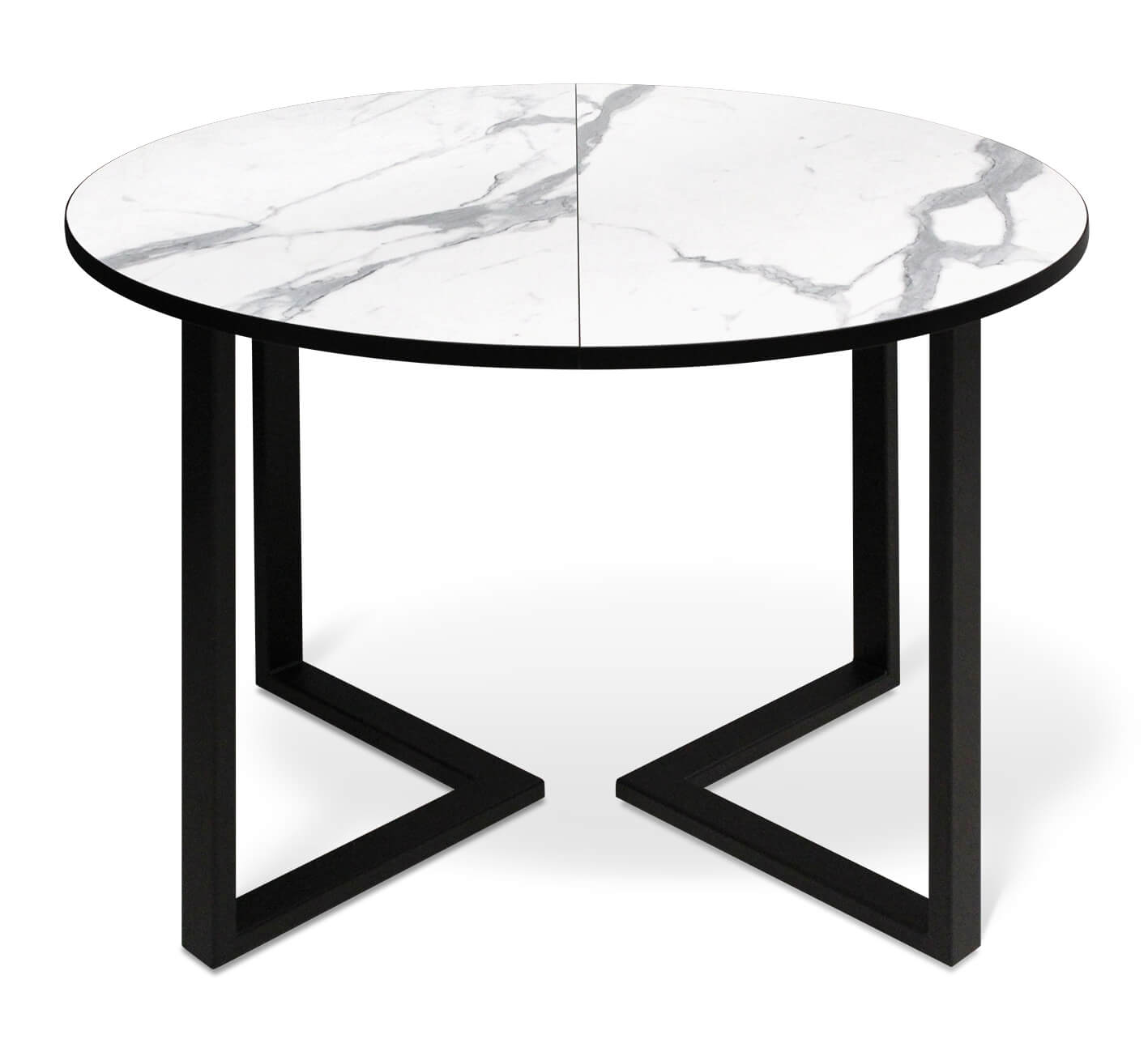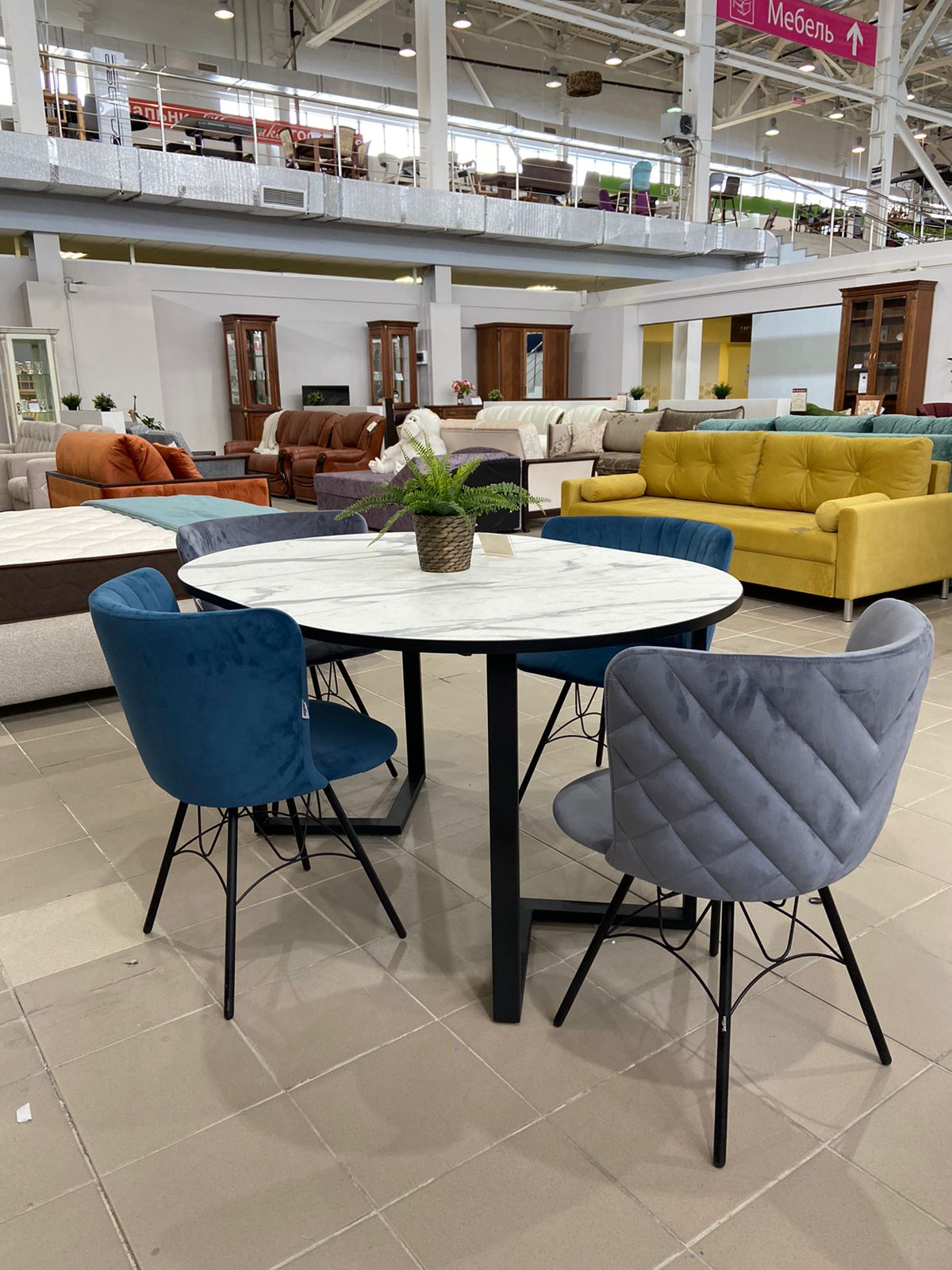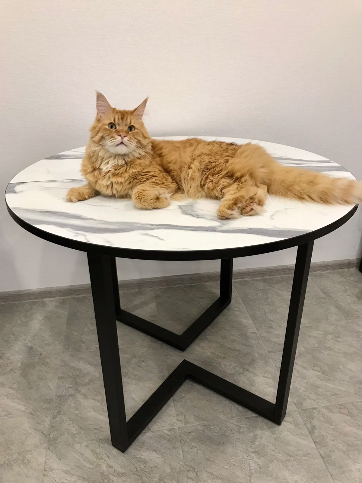 Необычный дизайн ножек не только добавляет в интерьер ломаных линий, но и позволяет сэкономить пространство для ног. Выпуклый рисунок натурального камня на столешнице отлично дополнит классический интерьер обеденной зоны.