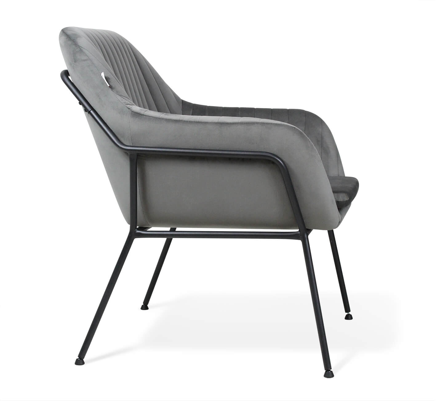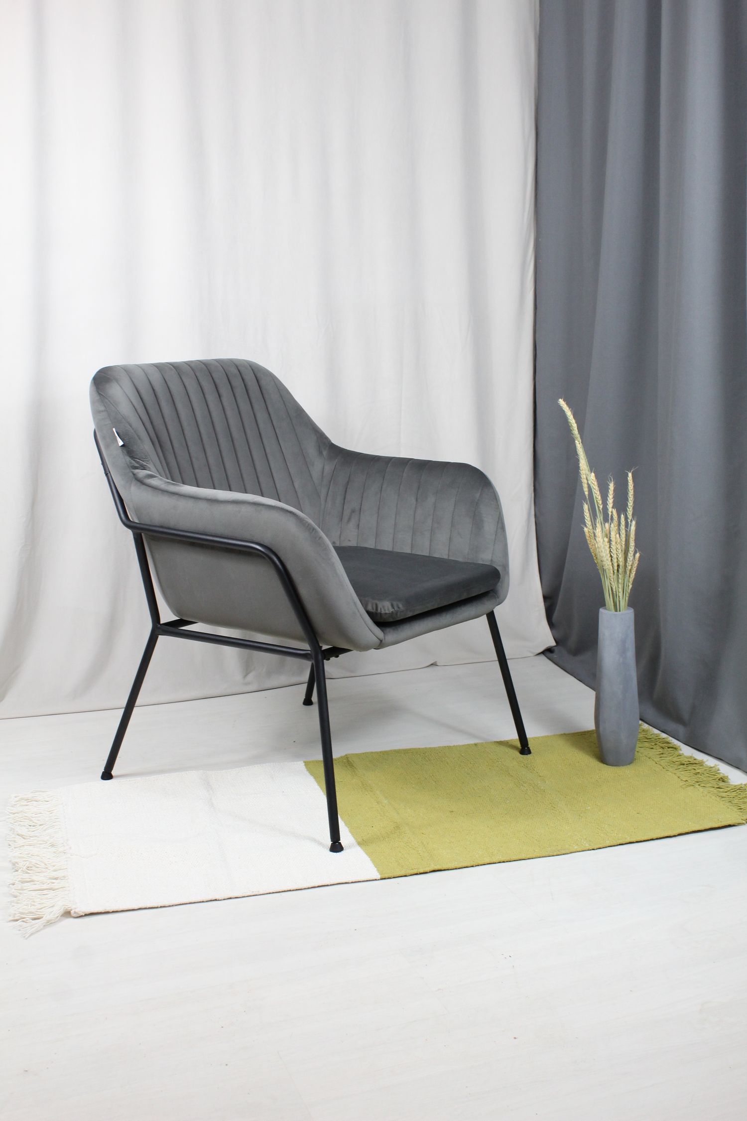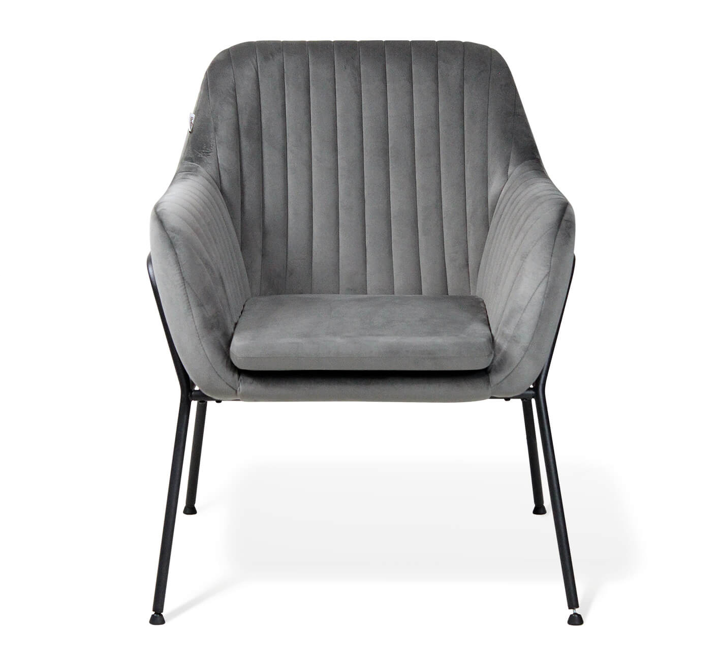 Мягкое уютное кресло в современном стиле, обитое серым микровелюром, на каркасе из черного металла. Благодаря своему универсальному дизайну и лаконичному сочетанию цветов такое кресло гармонично впишется практически в любой современный интерьер кафе, бара, ресторана, офиса, общественных учреждений, залов ожидания или дома.