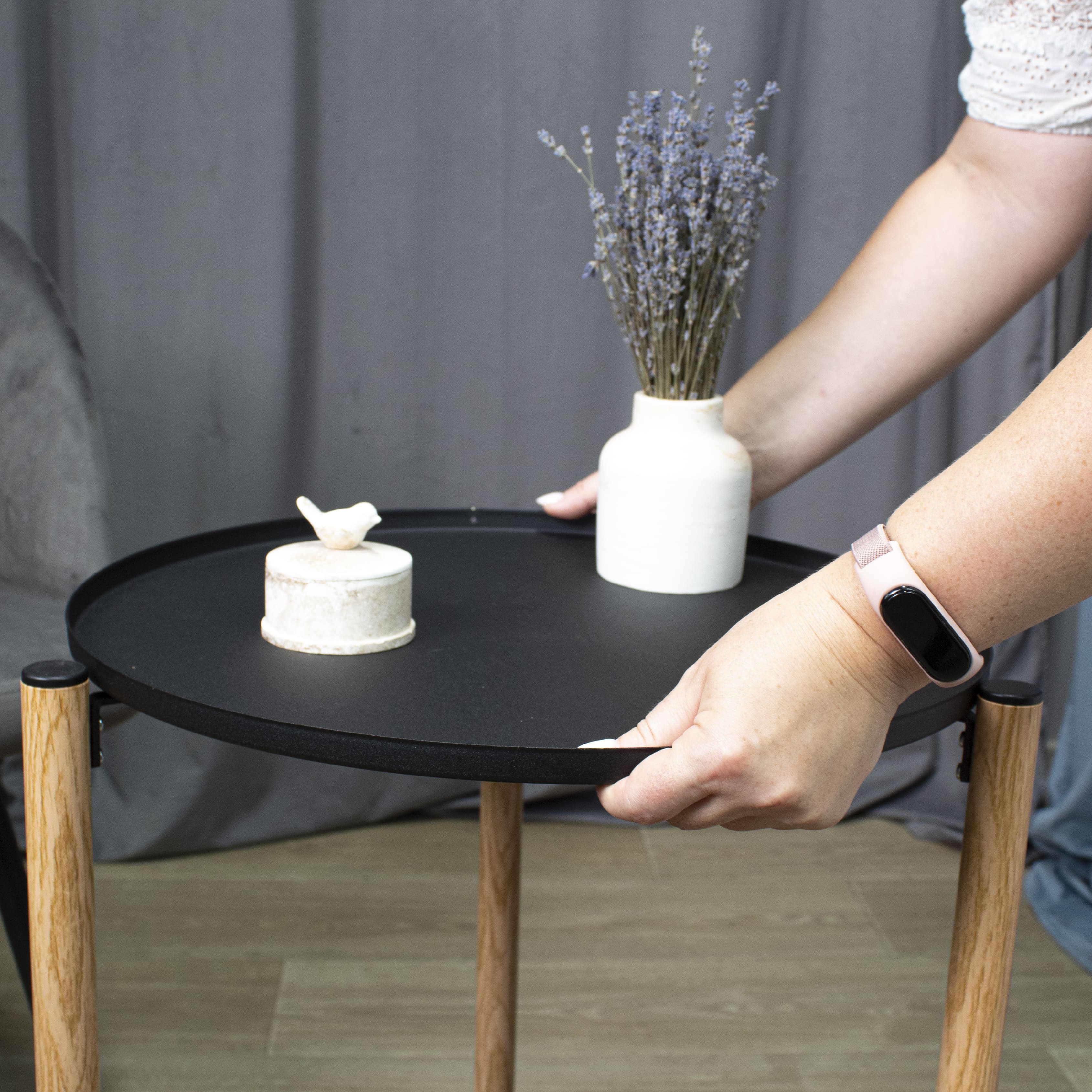Столешницы легко снимаются и можно использовать в качестве подноса. Бортики по краю столешниц позволяют бокалам и тарелкам не упасть во время использования.