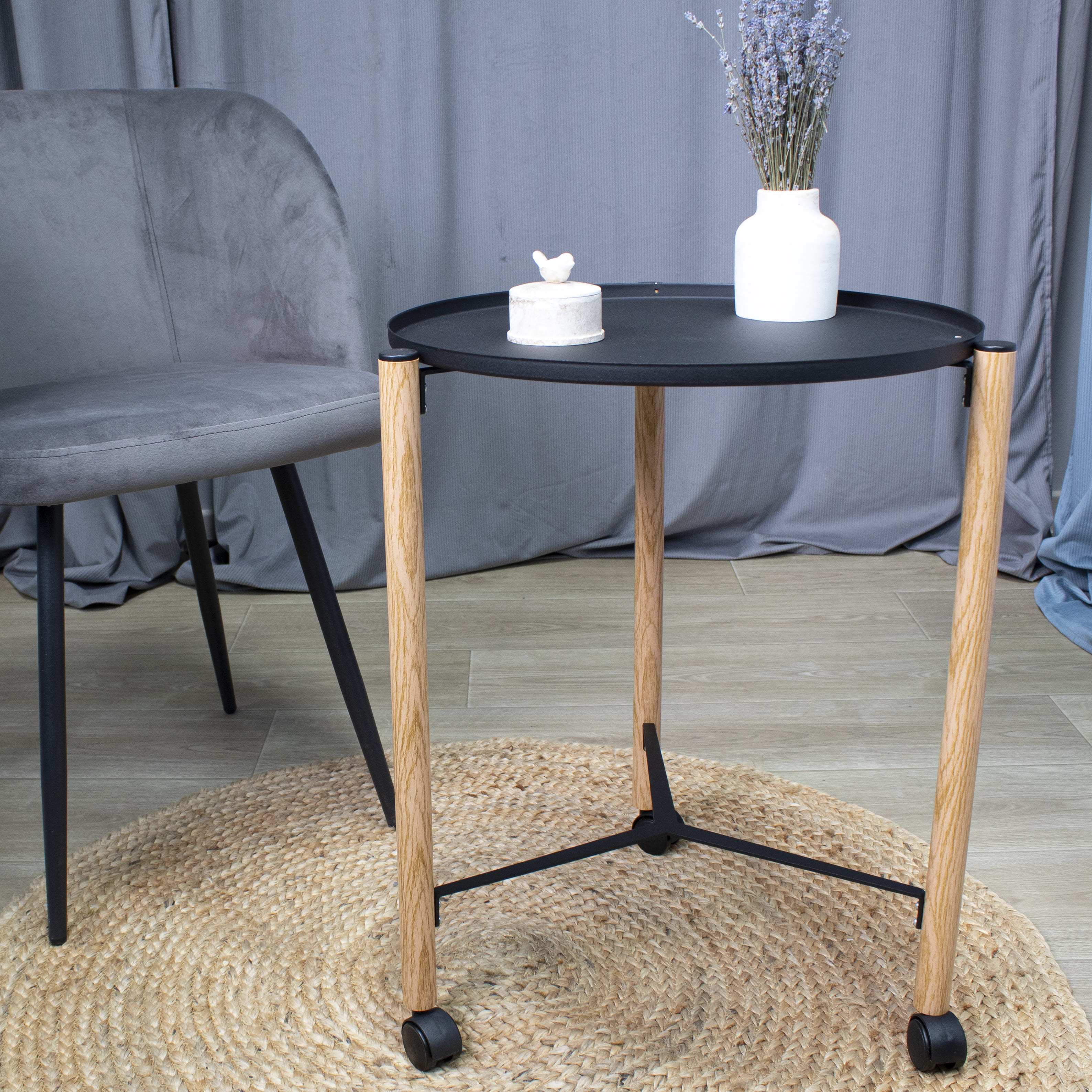 Столик мобильный и удобный в использовании, так как его легко перемещать по помещению с помощью колес.
