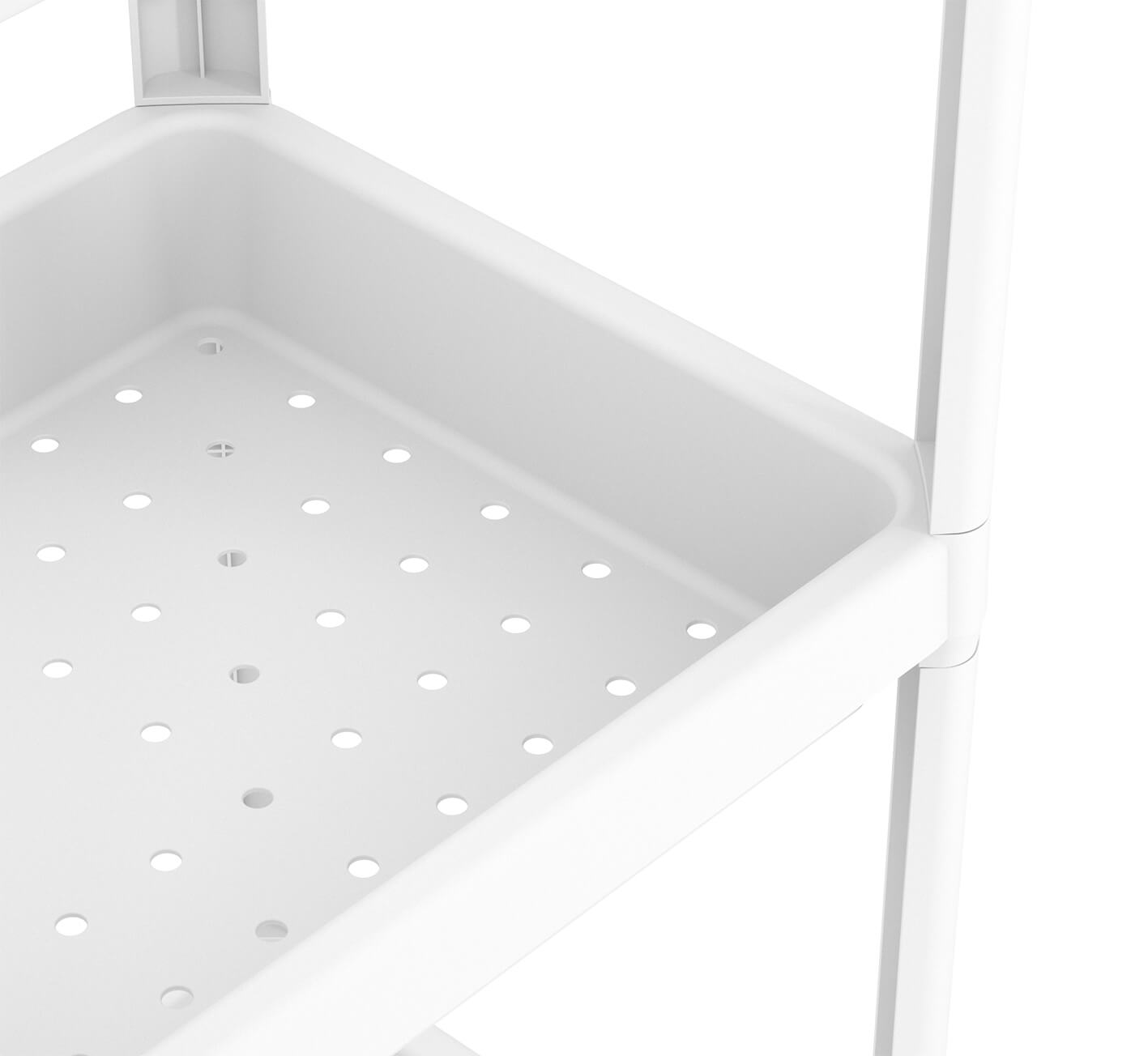 Этот стеллаж оснащён четырьмя полками с бортиками высотой 6 см , которые надежно защищают ваши вещи от падения. На дне каждой полки имеются отверстия, благодаря которым влага и вода не будут накапливаться.