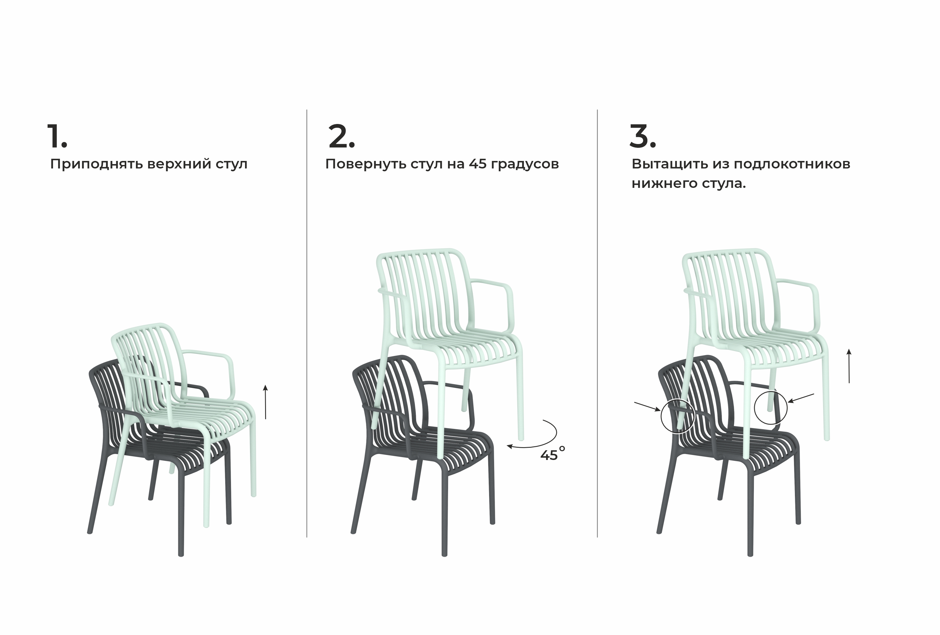 ВАЖНО! Для штабелирования стульев, нужно повернуть стул на 45 градусов и разместить между подлокотниками нижнего стула. Для извлечения стула из штабеля действия повторить в обратном порядке.