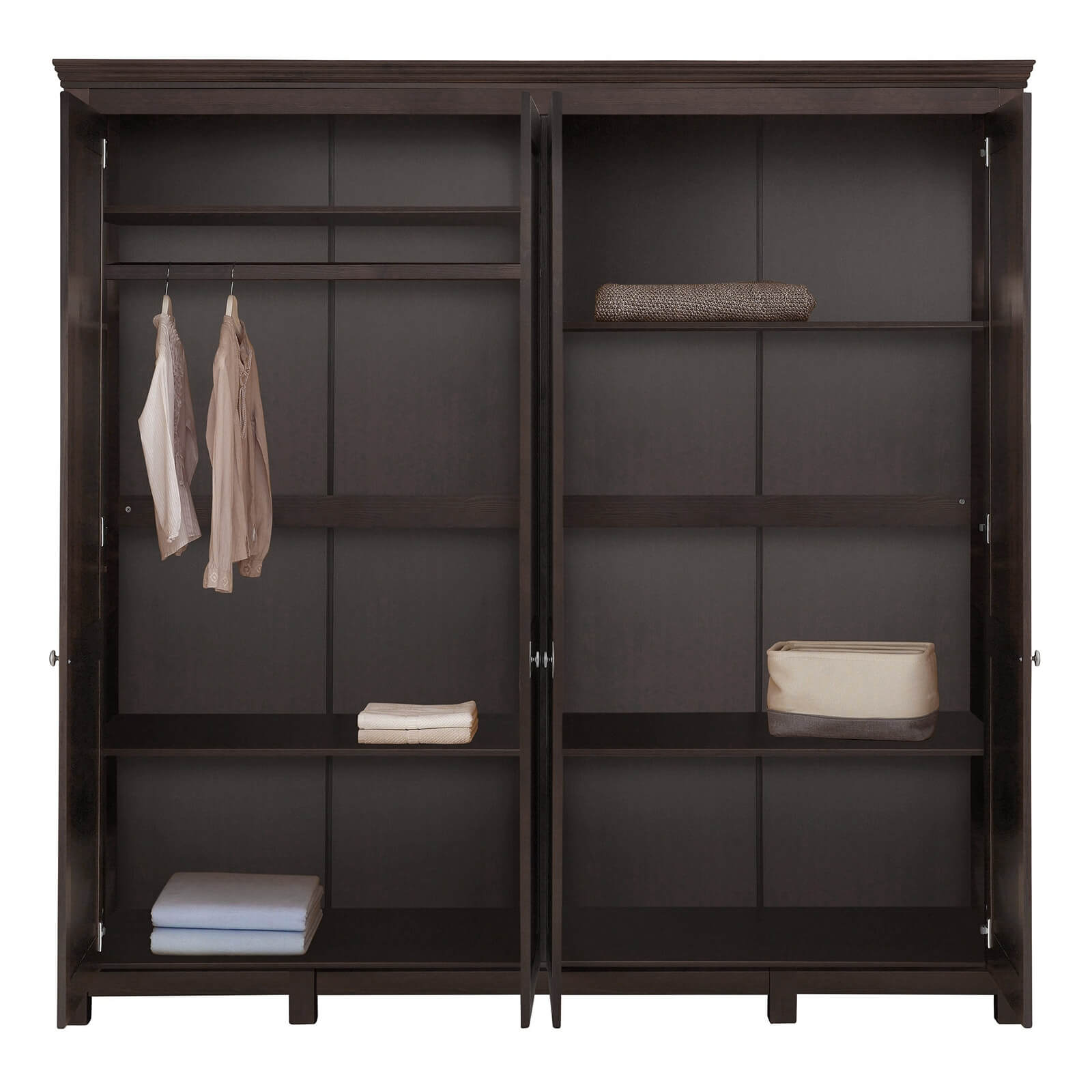 За четырьмя распашными дверями вы найдете пространство для одежды со штангой, три регулируемые полки, секции для головных уборов и обуви.