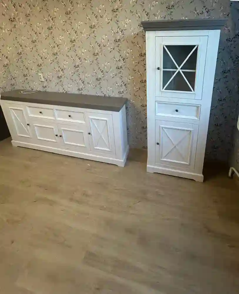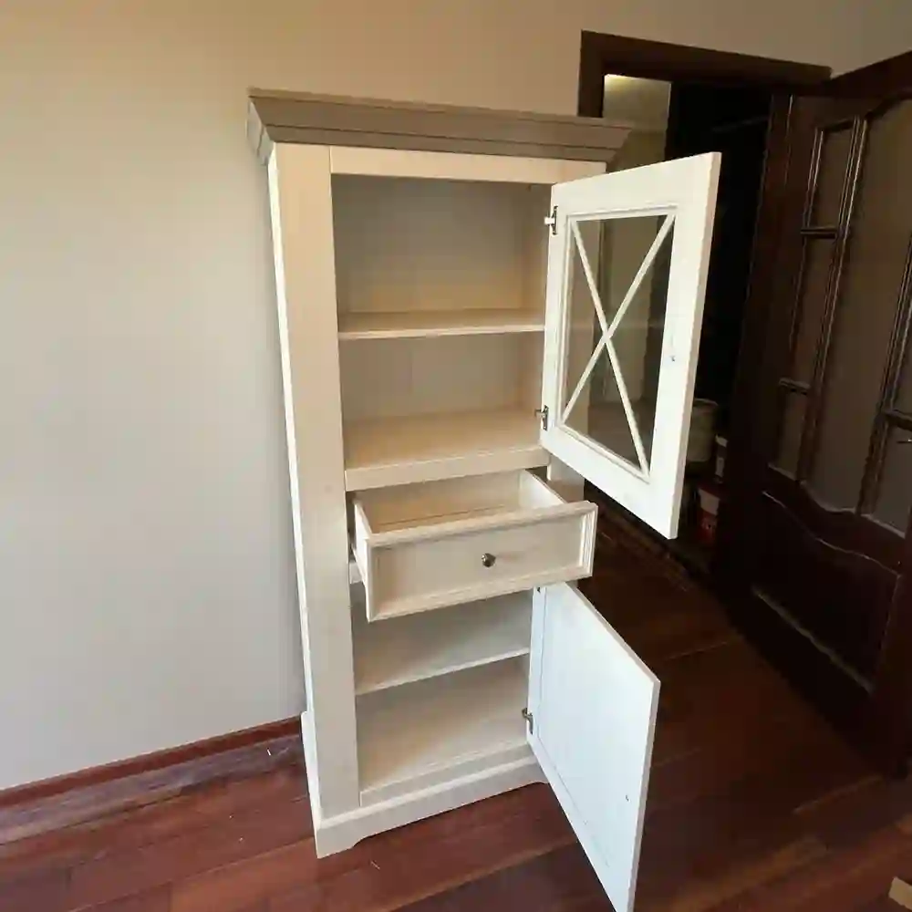 Шкаф Форест имеет две двери и один ящик на роликовых направляющих от крупнейшей немецкой компании Hafele. За верхняя дверкой со стеклом и нижней дверкой расположено по одной полке. В шкафу можно хранить посуду, кухонную утварь, книги и другие нужные вещи.