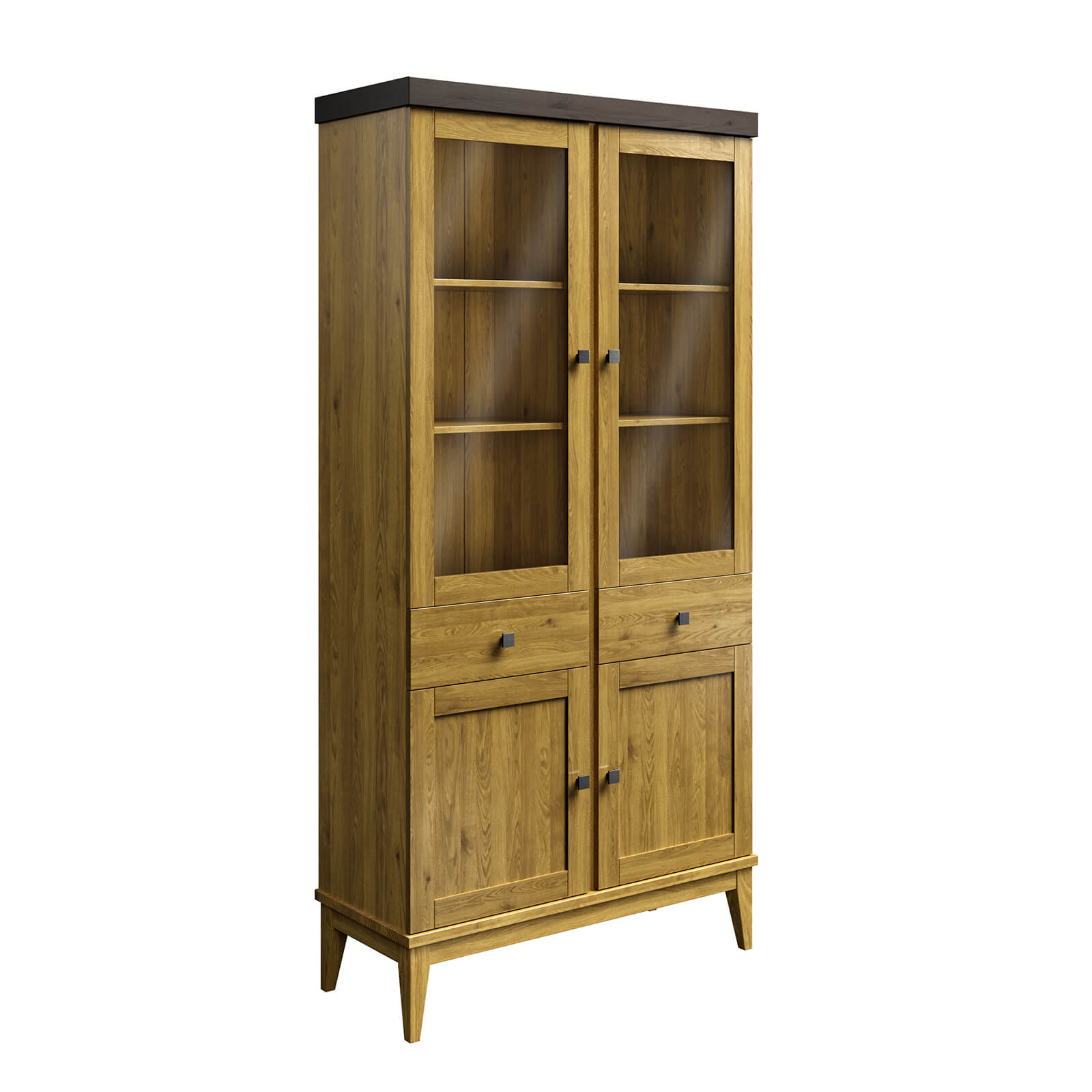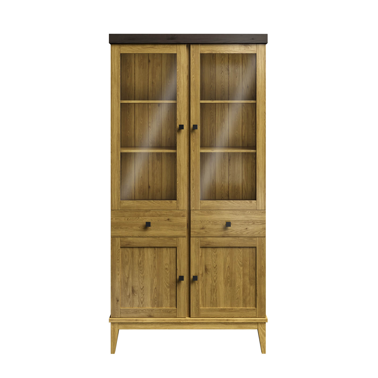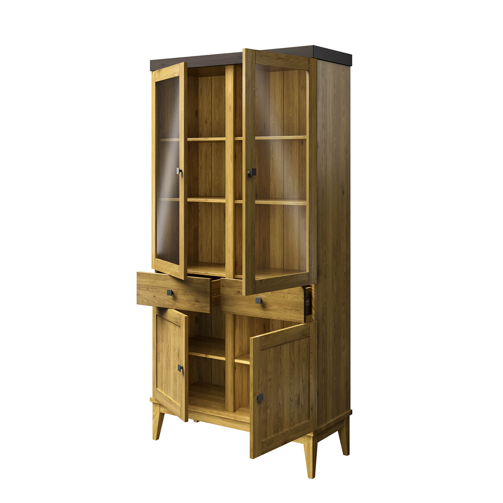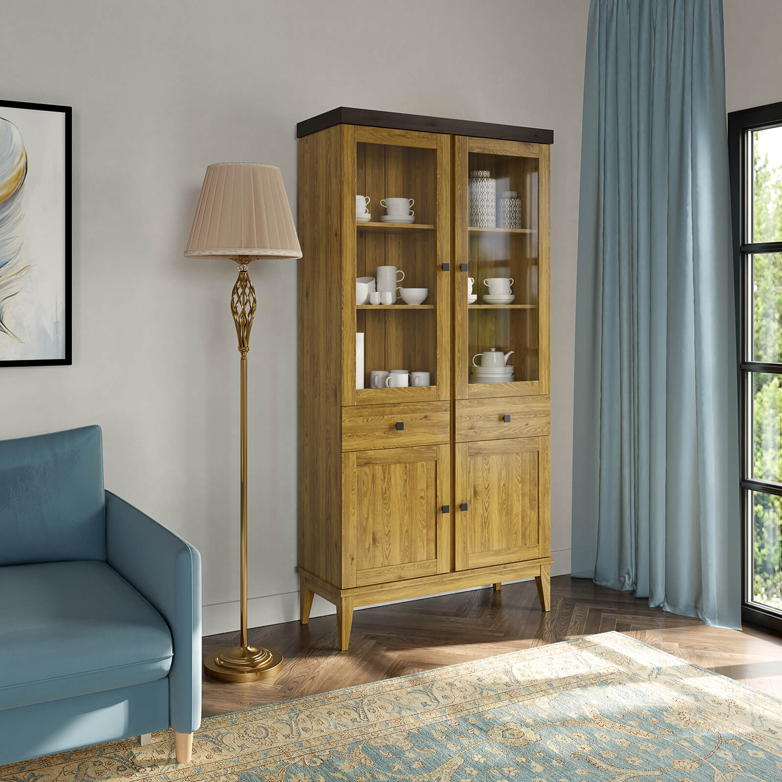 Шкаф имеет две распашные стеклянные двери и две филёнчатые двери, что обеспечивает удобный доступ к посуде и позволяет видеть её содержимое.