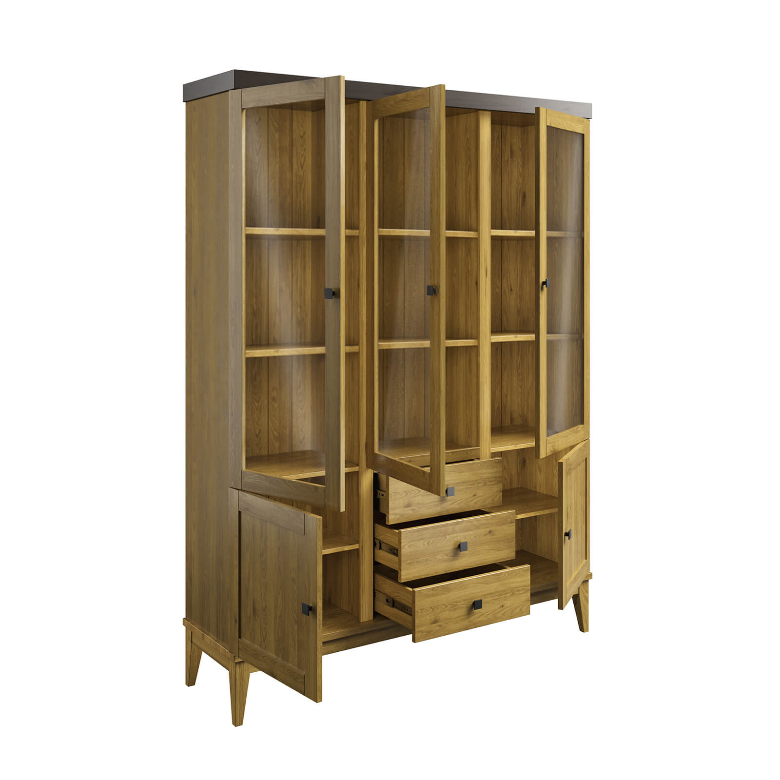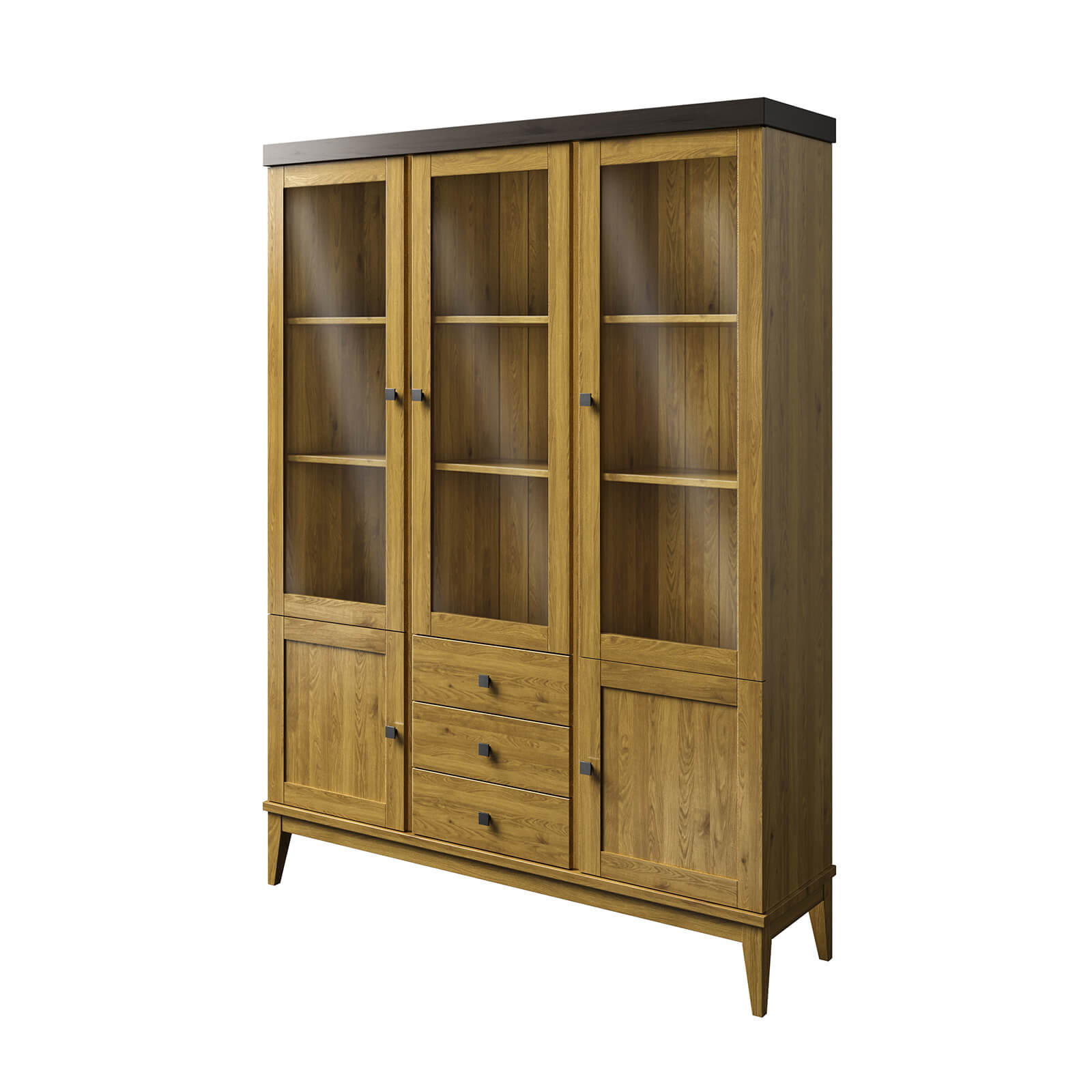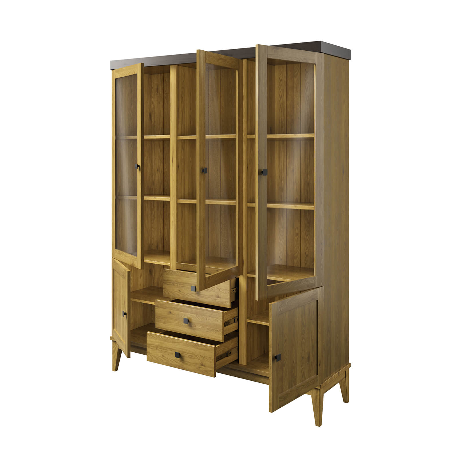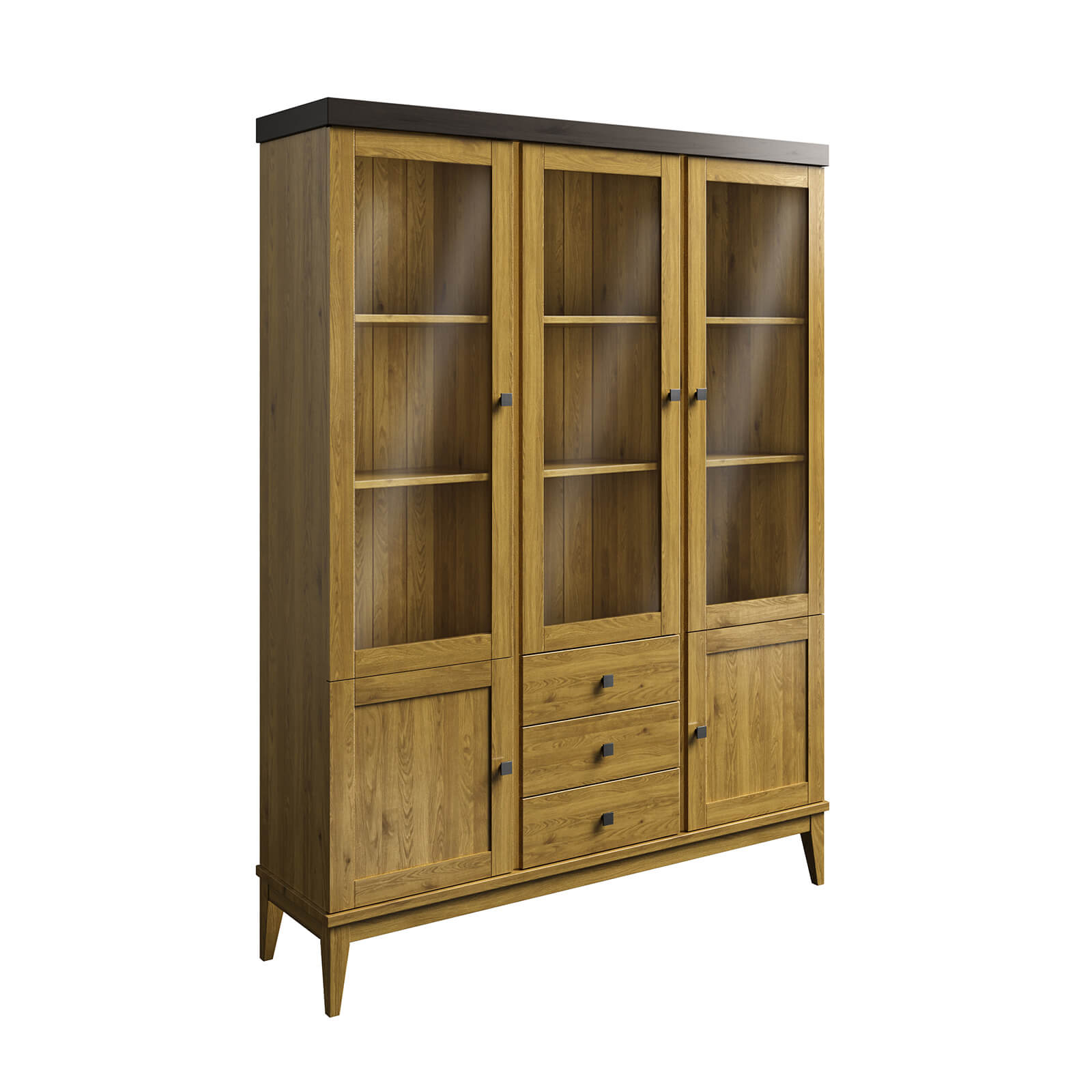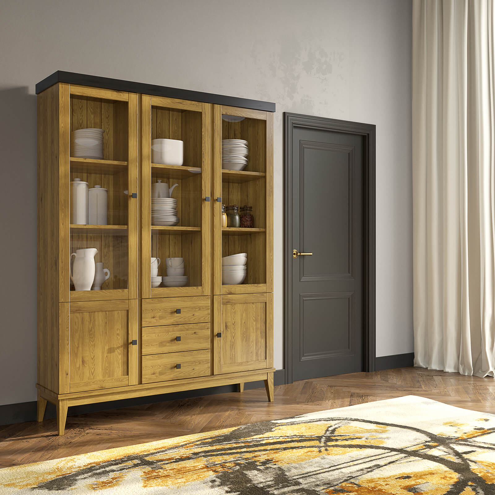 Верхняя часть шкафа оснащена тремя стеклянными распашными дверями, которые обеспечивают лёгкий доступ к вашей посуде. Нижняя часть состоит из двух филёнчатых дверей и трёх выдвижных ящиков, где можно хранить столовые приборы, салфетки и другие аксессуары.